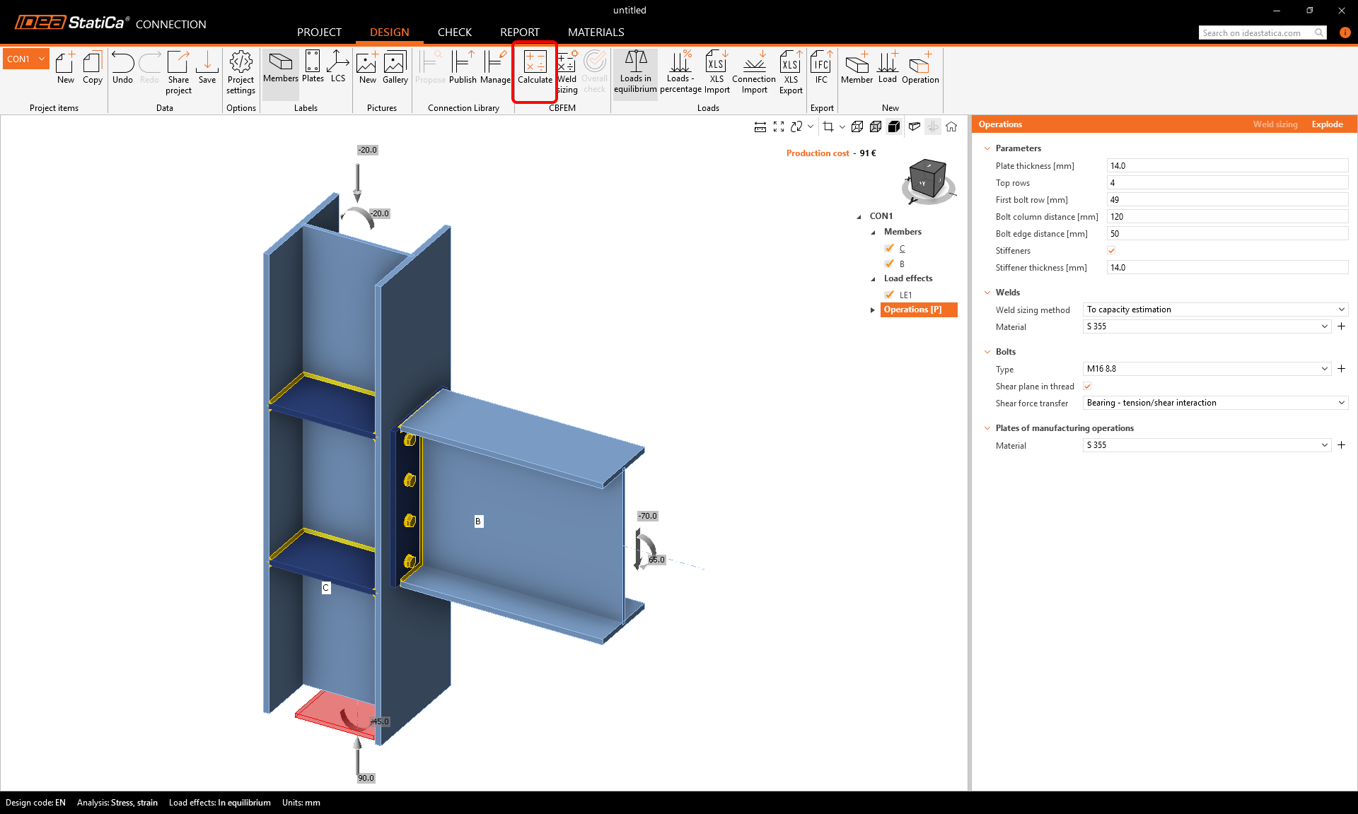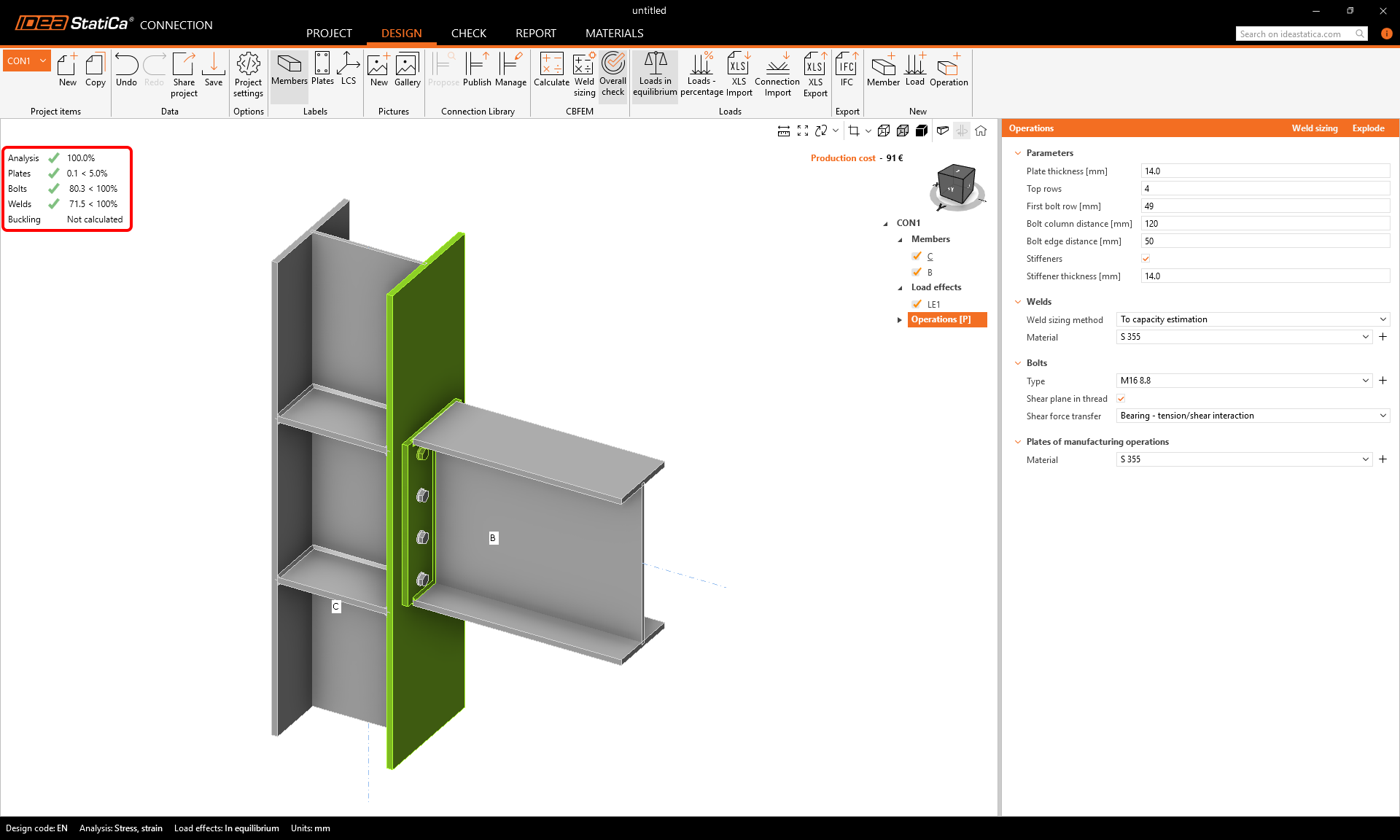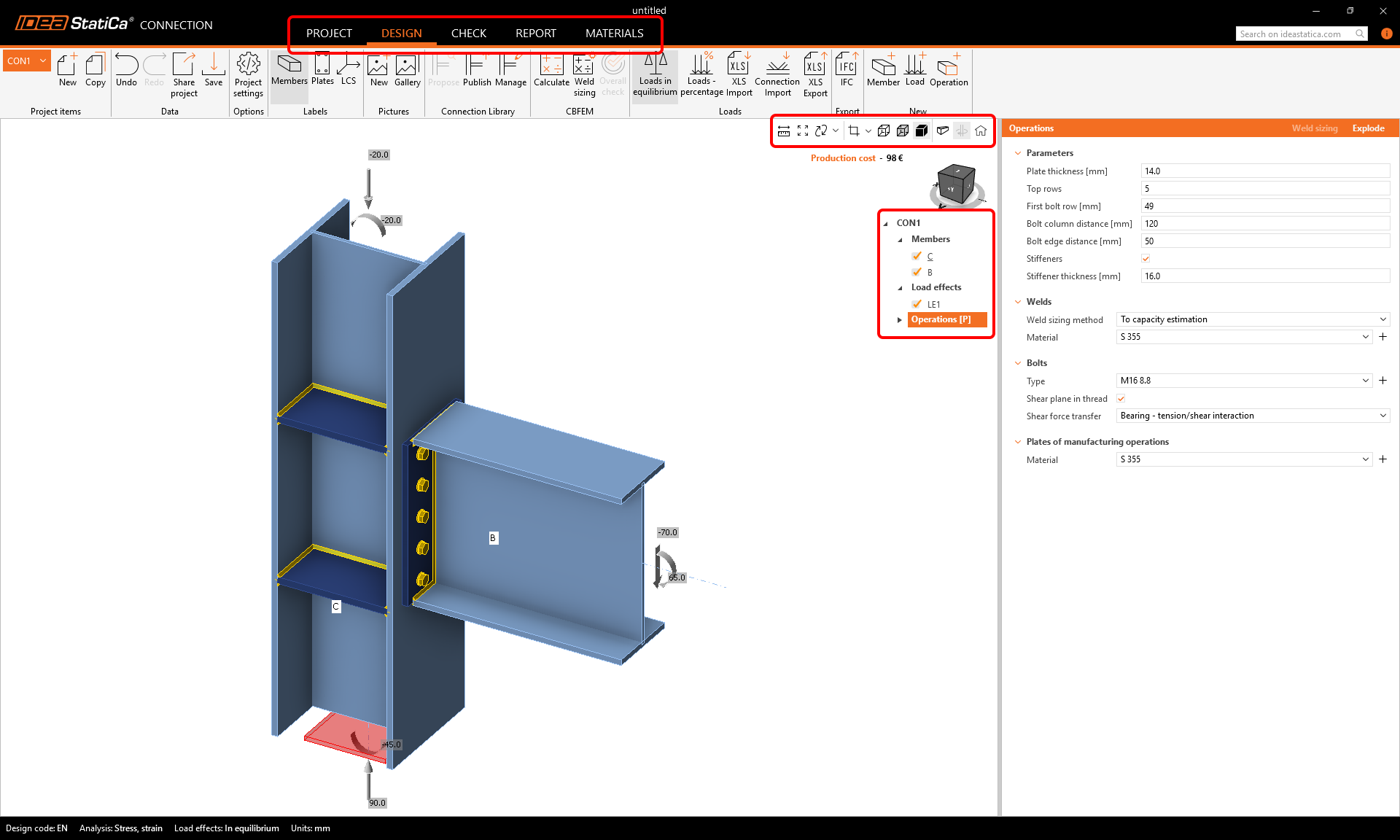 In het onderdeel Bewerkingen definieert u het ontwerp van de verbinding. Met de geselecteerde parametrische template kun je de eigenschappen van je ontwerp direct bewerken op het tabblad Bewerkingen.