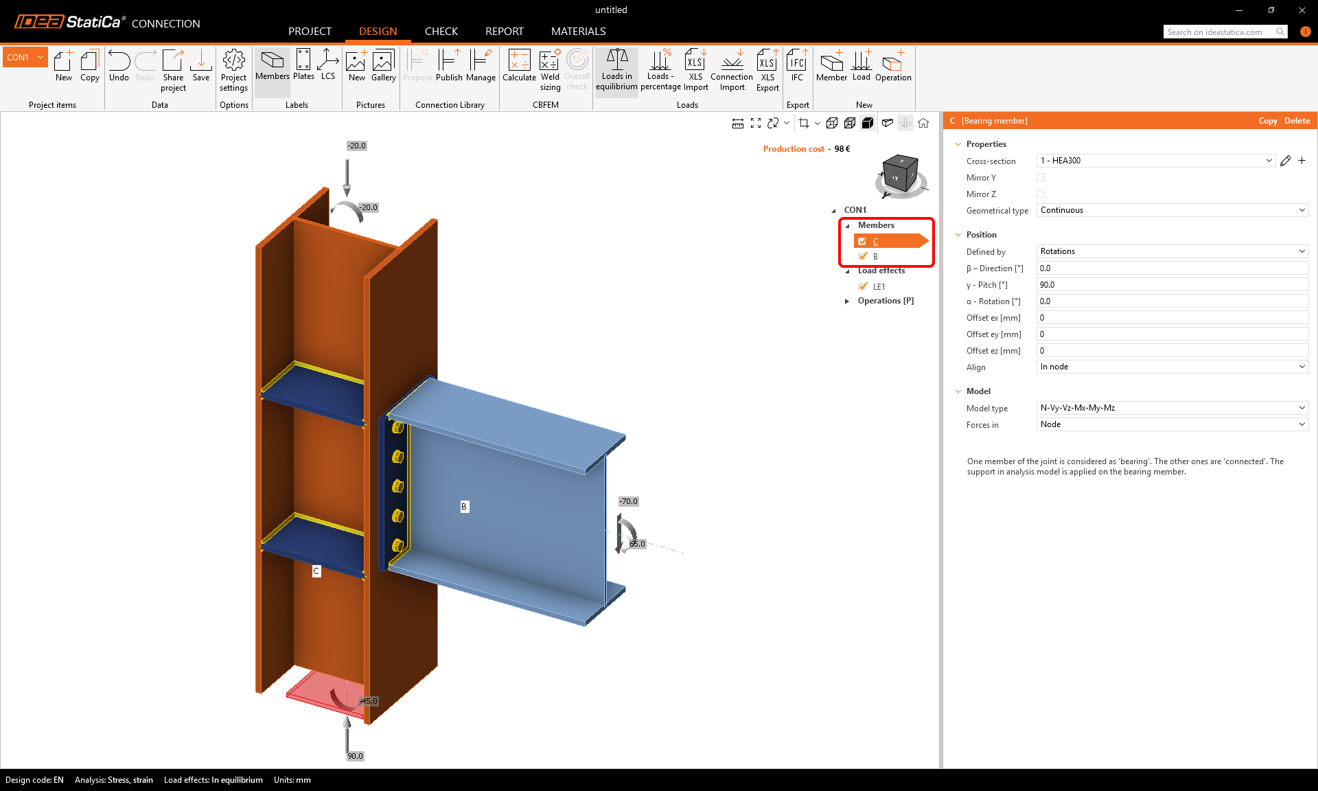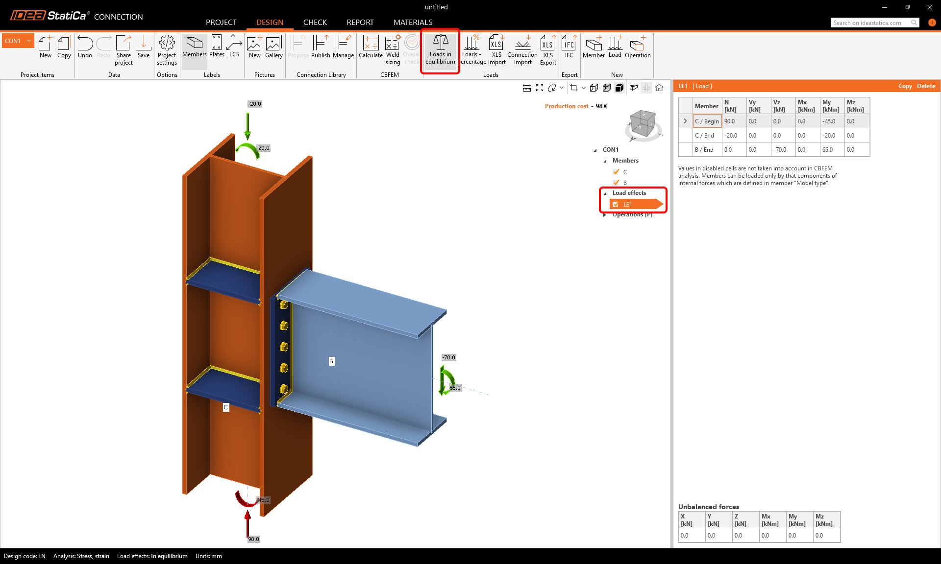 In de Belastingseffecten definieer je de interne krachten in de verbindingsknoop voor elke staaf. Het is belangrijk om de gedefinieerde belastingen in evenwicht te houden. Houd de interne krachten aan zoals ingevoerd door de template.