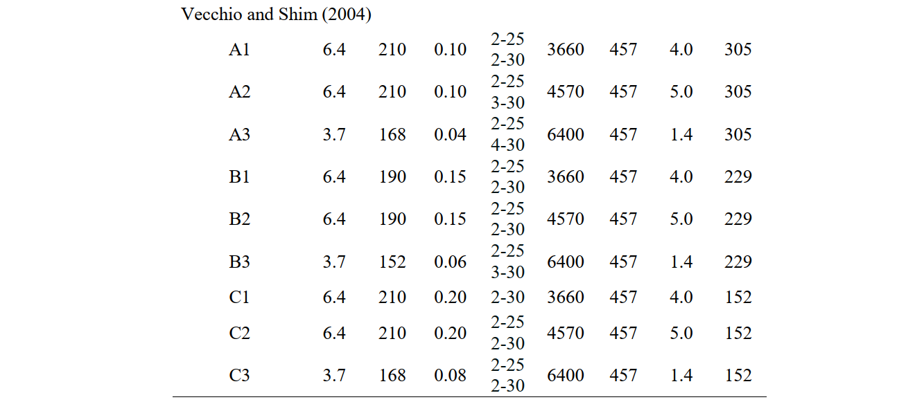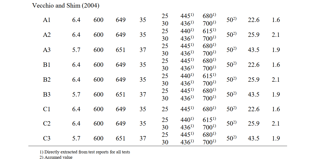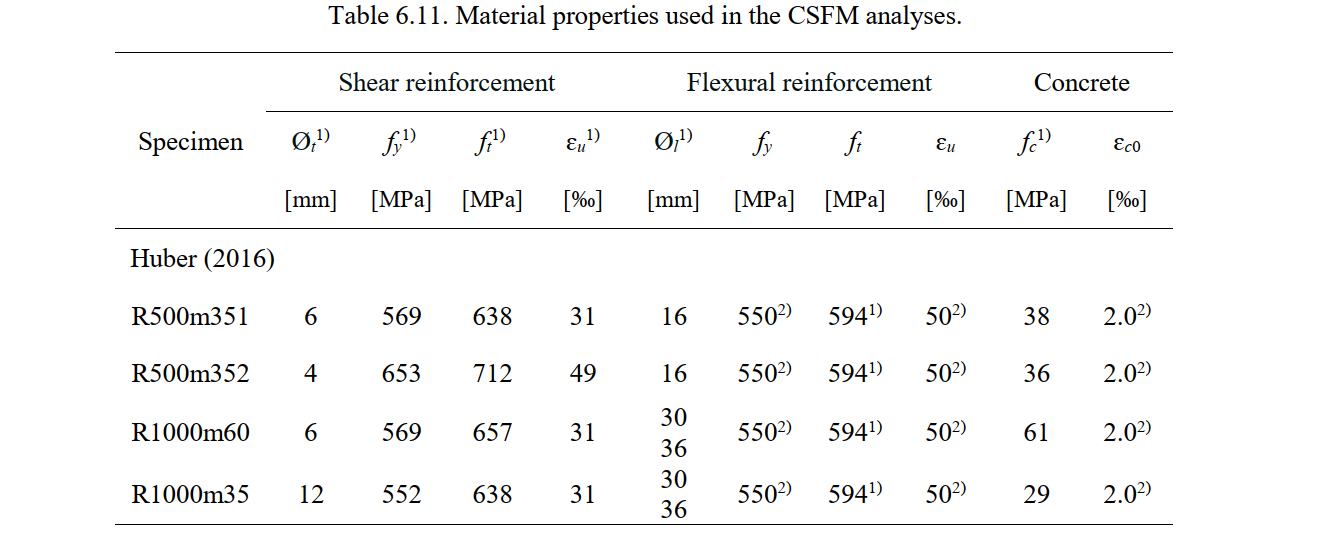 The material properties of the shear reinforcement, the flexural reinforcement and the concrete used in the CSFM analysis are summarized in Table 6.11. Most of the material properties required for the CSFM analysis were available in the corresponding test reports. The values that had to be assumed are indicated in Table 6.11.