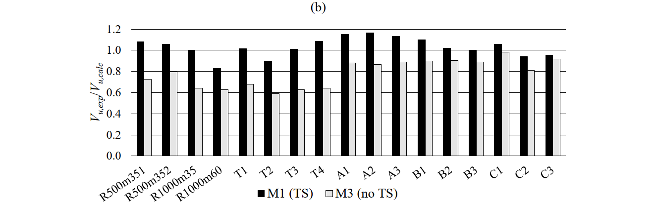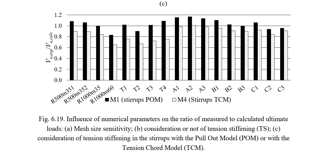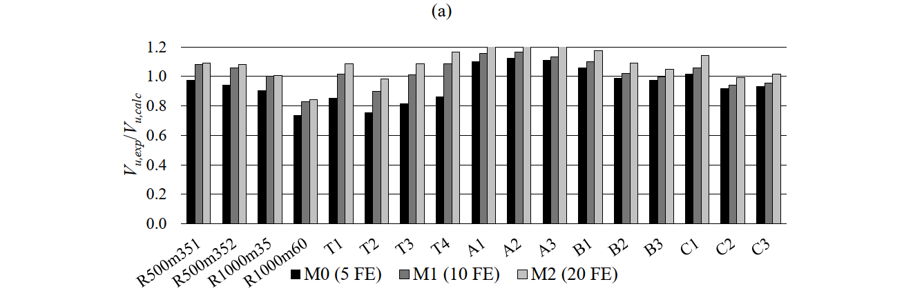 The sensitivity of the strength predictions of the CSFM to the different analyzed numerical parameters is shown in Fig. 6.19 by means of the ratio of experimental to calculated ultimate shear forces (Vu,exp/Vu,calc). The ultimate load is markedly sensitive to the selected size of the finite elements (see Fig. 6.19 a). The maximum difference between the coarsest and finest mesh (M0 and M2) amounts to 36% (Test 4 from Piyamahant (2002)), with an average difference around 15%. The predictions using default parameters (5 finite elements over the beam’s height in model M0) slightly overestimate the experimental strength (around 5%). When refining the mesh to 10 or 20 finite elements over the beam’s height (models M1 and M2, respectively), excellent strength predictions which are slightly on the safe side of the ultimate loads can be achieved. No changes in the failure modes were observed when varying the finite element mesh size. Even the results with the default mesh size are very satisfactory, considering that several experiments exhibited brittle shear failures, which are challenging to predict using design approaches.