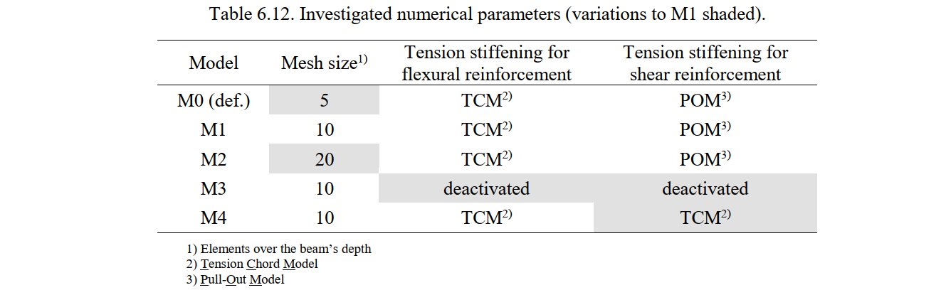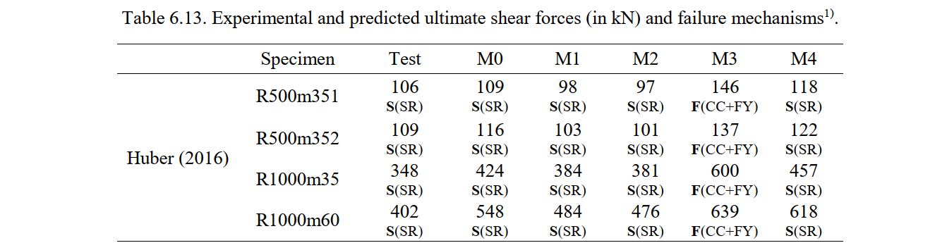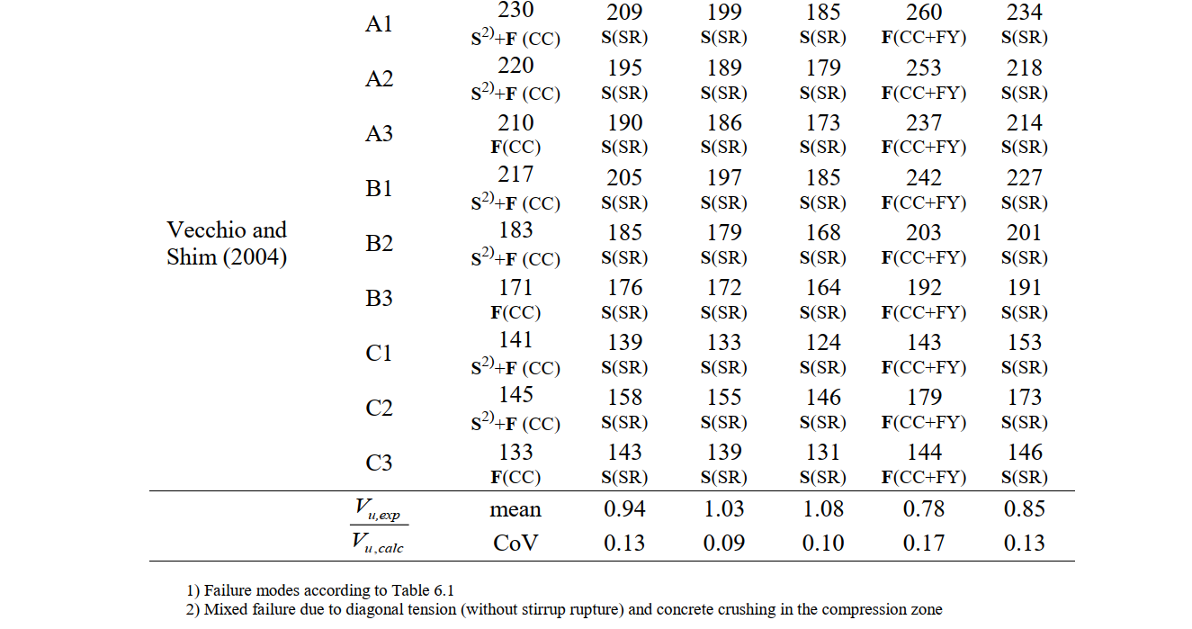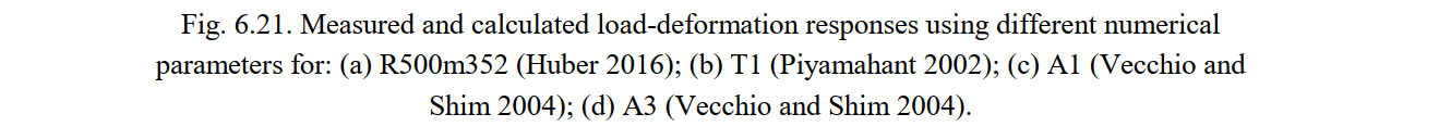 Table 6.13 summarizes the ultimate shear forces measured in the tests (Vu,exp), the ultimate shear forces predicted by the CSFM (Vu,calc), and the respective failure modes. This table also provides the mean and coefficient of variation (CoV) of the ratios between the measured and the calculated ultimate loads for each numerical model. In all analyses (except M3, in which tension stiffening was neglected) a shear failure in the stirrups was predicted by the CSFM. This corresponds well with the failure mechanisms observed in the tests from Huber (2016) and Piyamahant (2002), but mismatches those observed in Vecchio and Shim (2004). The failure to capture the failure modes well led in this case to slightly conservative estimates of the ultimate load. Overall, the default parameters provide good strength estimates but slightly on the unsafe side (by 6% on average).