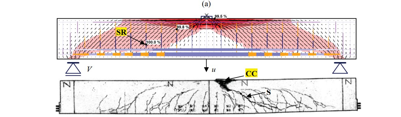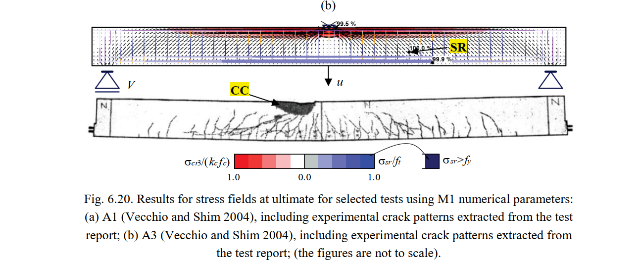 Fig. 6.20 shows the continuous stress field results (principal compressive stresses (σc) and steel stresses (σsr) at the cracks) for specimens A1 and A3 from Vecchio and Shim (2004), in which the predicted shear failures are highlighted. These results were calculated using the numerical parameters M1 (default parameters, except for the mesh size, which is half of the default value). As can be seen from the stress fields, the compressive stress in the compression zone due to bending is in the plastic branch (99.5 %). However, due to the considered criteria for concrete crushing, the rupture of the stirrups occurs before concrete crushing happens.