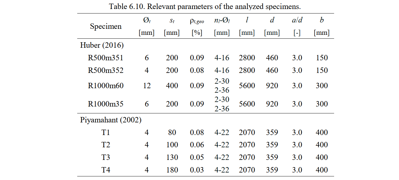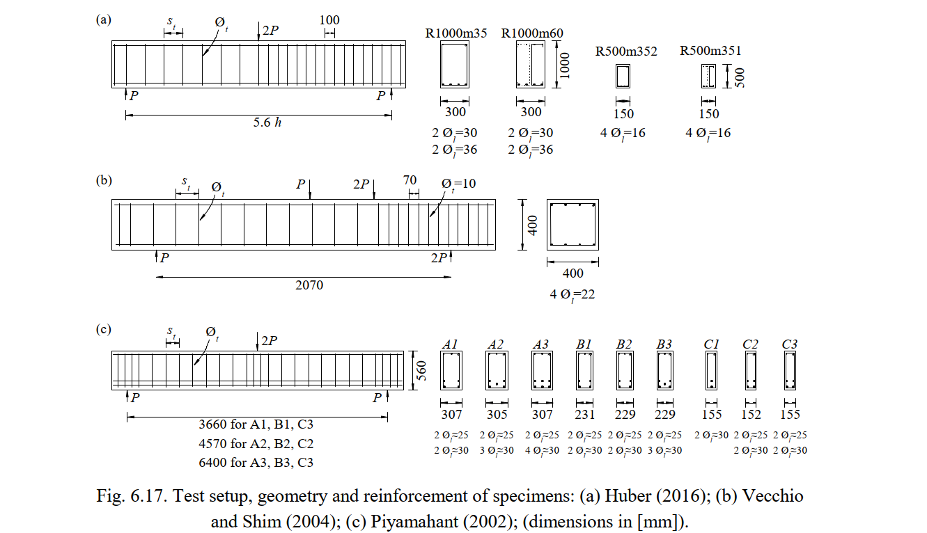 Experimental setup Fig. 6.17 shows the geometry, test setups and reinforcement layouts of the analyzed experiments. Information on the shear reinforcement (diameter (Øt) , spacing (st) and geometric reinforcement ratio (ρt,geo)), the flexural reinforcement (number (nl) and diameter (Øl)) and  geometry (effective depth (d), shear slenderness (a/d) and width of the beams (b)) is presented in Table 6.10. Tests R1000m60 and R500m351 conducted by Huber (2016) had one-leg hooks, while in all other tests used two-leg closed stirrups. In the analyzed tests from Piyamahant (2002) the geometry and the flexural reinforcement were kept constant, while in the other two studies they were varied.