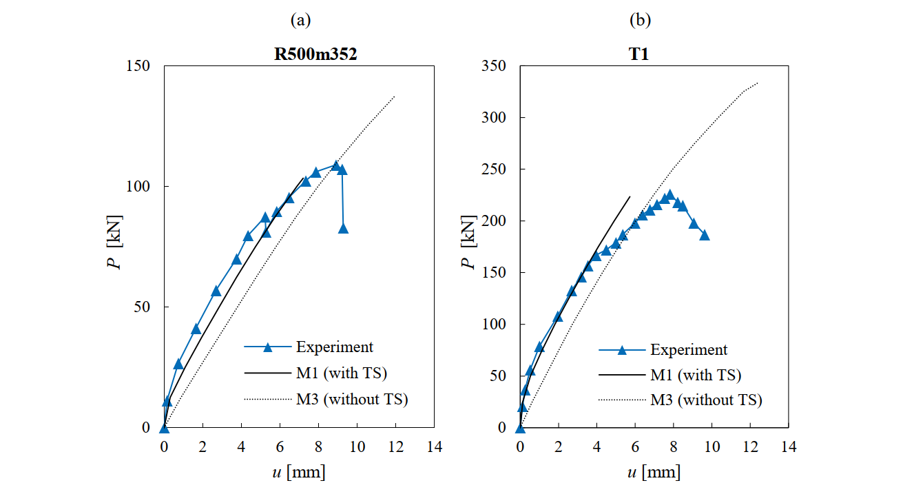 • Neglecting tension stiffening leads to a very pronounced overestimation of the ultimate load and deformation capacity. Even when modeling tension stiffening in the stirrups by means of the Tension Chord Model, the predicted ultimate load is clearly on the unsafe side. The best results are obtained when considering the effect of non-stabilized cracking in the stirrups for low amounts of reinforcement by means of the Pull Out Model. This is the tension stiffening model implemented by default in the CSFM.