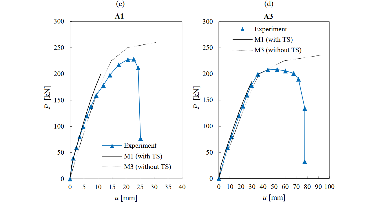 By taking into account tension stiffening effects, the experimental deflections can be predicted fairly well for the whole loading history, though the deflections at peak load are slightly underestimated. In particular, in Test A3 from Vecchio and Shim (2004), the observed plateau in the experiments due to yielding of the flexural reinforcement cannot be properly captured in the numerical analysis since the rupture of the stirrups is predicted first. Neglecting tension stiffening effects leads to the overestimation of the ultimate loads and deformations. These statements for the analyses without tension stiffening are also valid when using M4 parameters (the TCM used both in the stirrups and the flexural reinforcement).