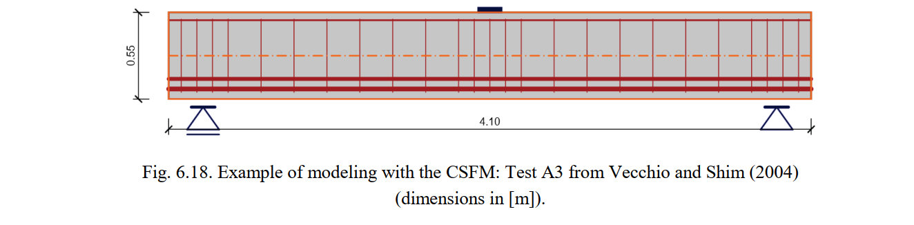 The geometry, reinforcement, support and loading conditions were modeled in the CSFM according to the experimental setups. Fig. 6.18 shows the modeling of Test A3 from Vecchio and Shim (2004) as an example.
