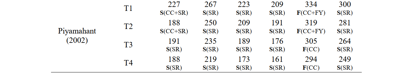 In order to compare the observed failure modes in the experiments with those predicted by the CSFM, the failure modes are classified as follows: flexural (F), shear (S) and anchorage (A). It should be noted that none of the experiments covered in this chapter exhibited an anchorage failure. Table 6.1 defines different failure subtypes depending on whether flexural and shear fail-ures are triggered by failure of the concrete or of the reinforcement. While yielding of the reinforcement does not represent a material failure, this is included as a failure subtype in combination with concrete crushing due to the importance of distinguishing concrete crushing failures without reinforcement yielding (very brittle) from those happening after the yielding of the reinforcement (which can exhibit a certain deformation capacity).