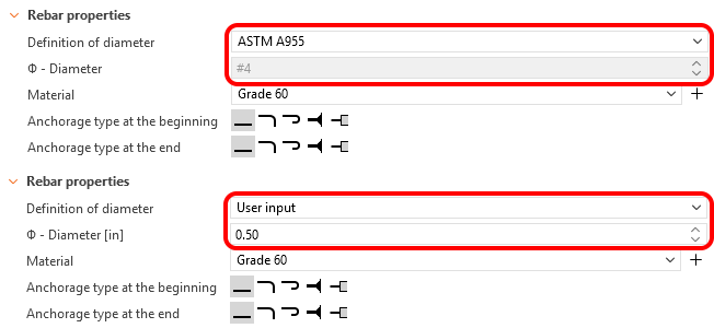 Een dubbele optie voor het invoeren van wapeningsdiameter is nu beschikbaar voor alle wapeningstypes, ofwel volgens ASTM A955-normen of als gebruikersinvoer op basis van de instellingen van de weergave-eenheid.