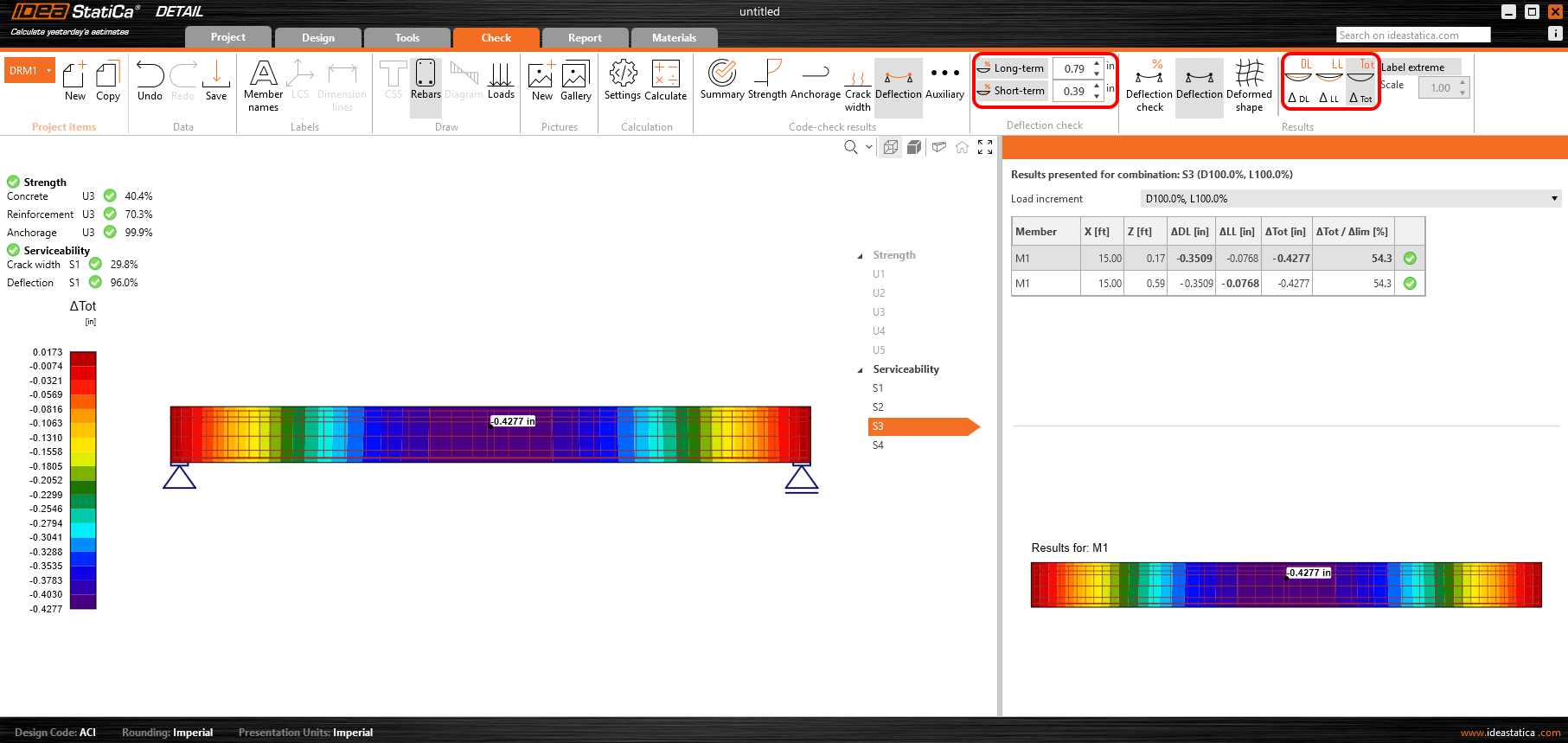 Doorbuigingen worden berekend voor elke combinatie die geselecteerd is op het tabblad Ontwerp. Controles worden echter alleen uitgevoerd als ze zijn ingeschakeld met de knoppen Lange termijn en Korte termijn in het bovenste lint, met limieten die zijn ingesteld volgens ACI 318-19 paragraaf 24.2. Tijdsafhankelijke doorbuigingen worden beoordeeld voor langetermijncombinaties op basis van deze limieten. Gebruikers kunnen doorbuigingen ook afzonderlijk bekijken voor Dode Last en Levende Last of de totale doorbuiging (DL + LL) bekijken. Belasting selectie is beschikbaar op het tabblad Ontwerp voor elk belastingsgeval.