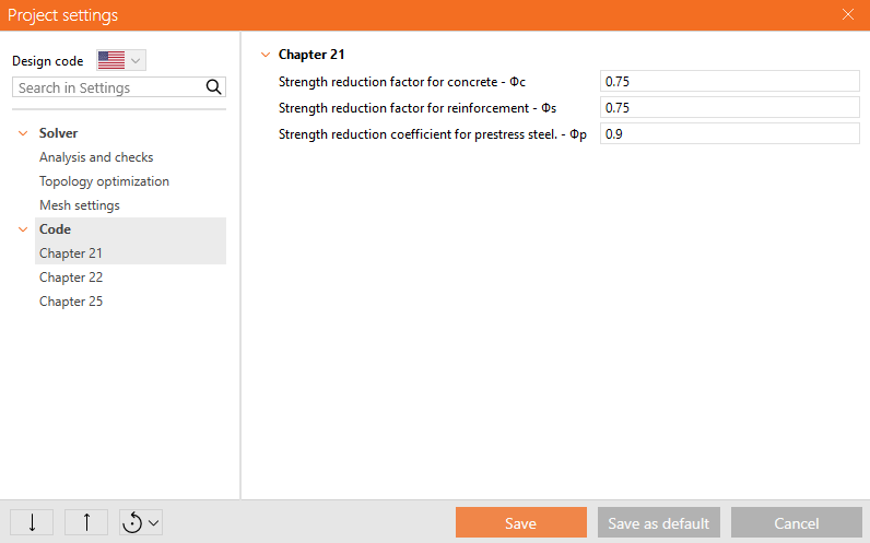 De meeste modellen in Detail zullen naar verwachting afschuifspanningen bevatten. Daarom zijn de standaard coëfficiënten ingesteld op 0,75 volgens ACI 318-19 Tabel 21.2.1. Voor modellen met spanningscontrole kunnen gebruikers de coëfficiënten naar behoefte aanpassen op basis van de tabel.