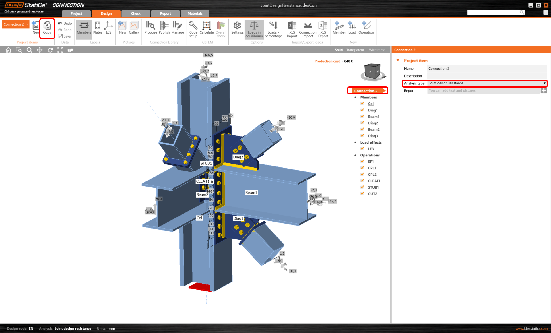 Kopieer eerst het projectitem om het vorige werk op te slaan en wijzig het analysetype in DR (Joint Design Resistance) voor het nieuwe projectitem (Connection 2).