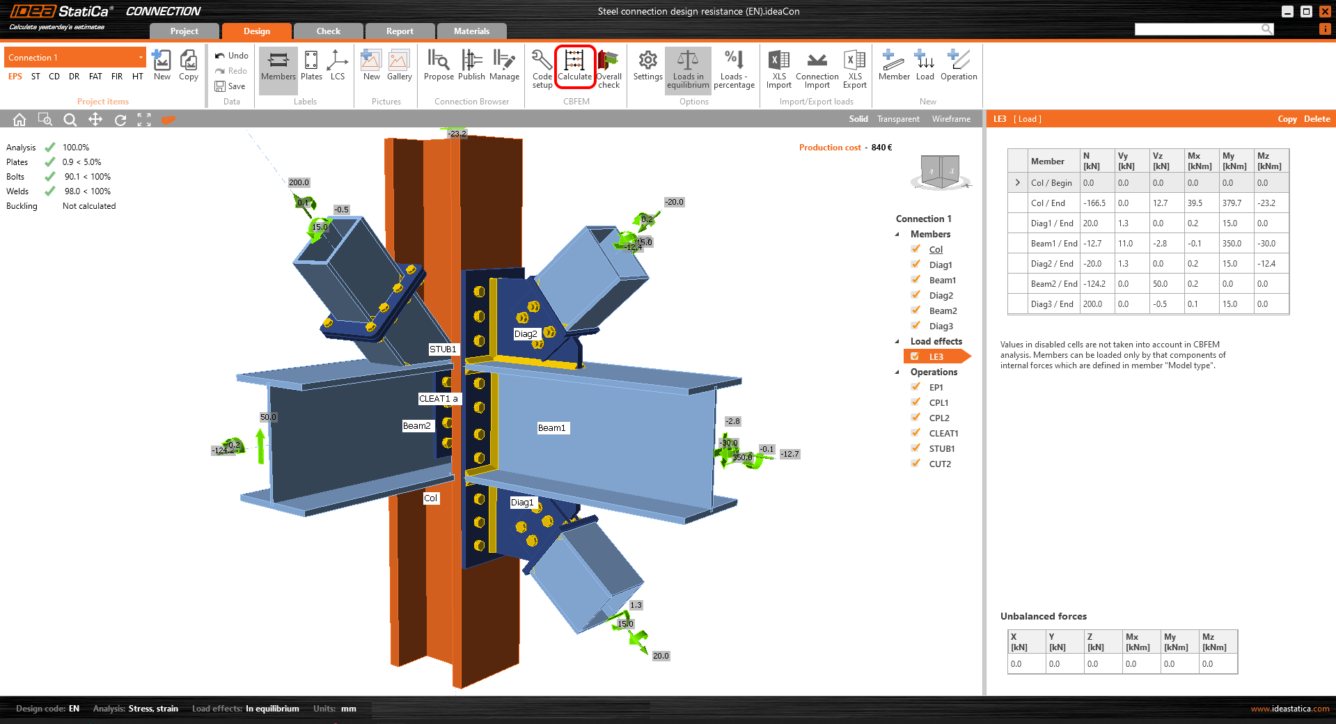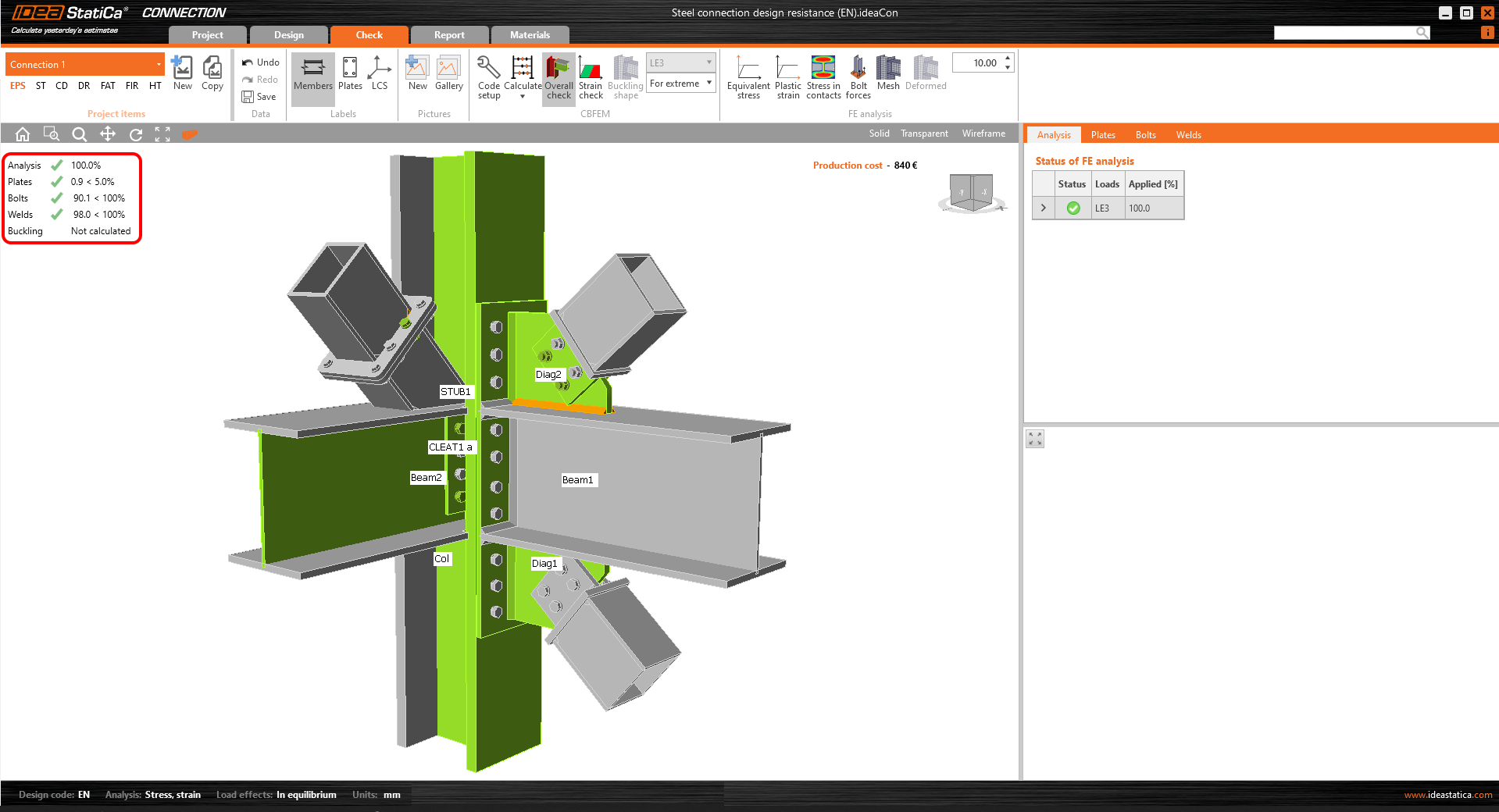 Ga verder naar het tabblad Controle en Verbindingsontwerpweerstand in de resultaattabellen. De applicatie berekent de factor (percentage) van de toegepaste belasting om de ontwerpweerstand van de verbinding aan te geven. Onder de tabel wordt de grafiek weergegeven.