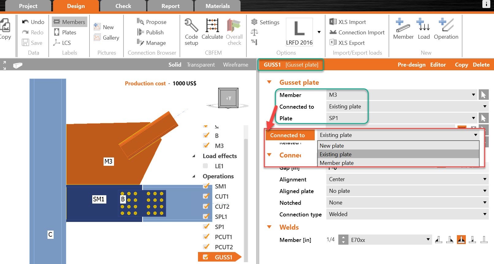 When using a gusset plate operation, the operation itself can create a new plate, but if there is the case that the plate is already in the model, the option of the existing plate in the model.
