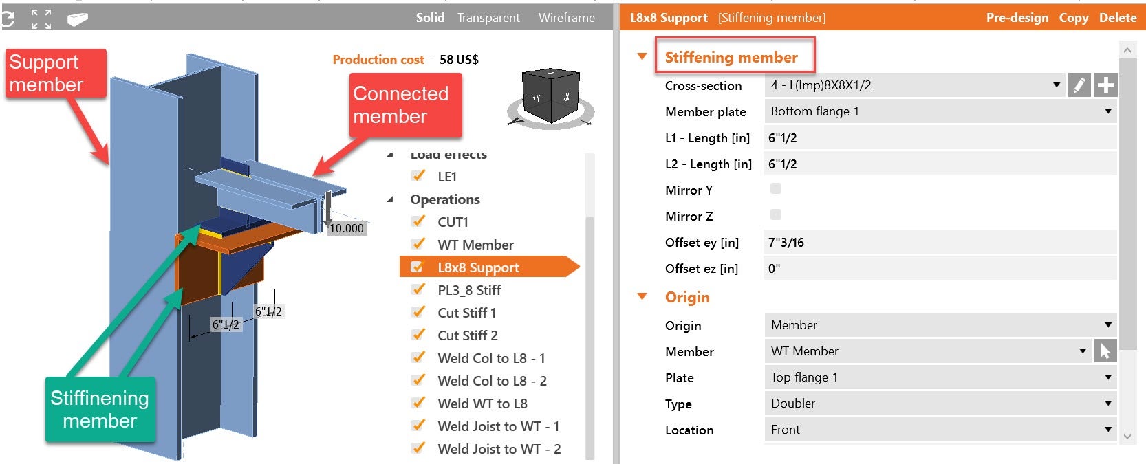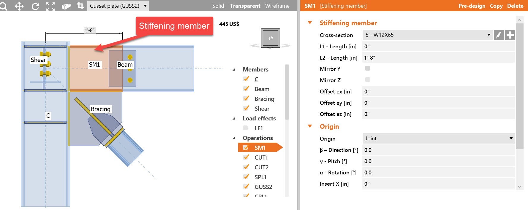 A stiffening member is an operation that helps to add a member in the model to be part of the connection. One of the keys to using a stiffening member is that you can not directly apply load to it. This operation helps in the next examples: