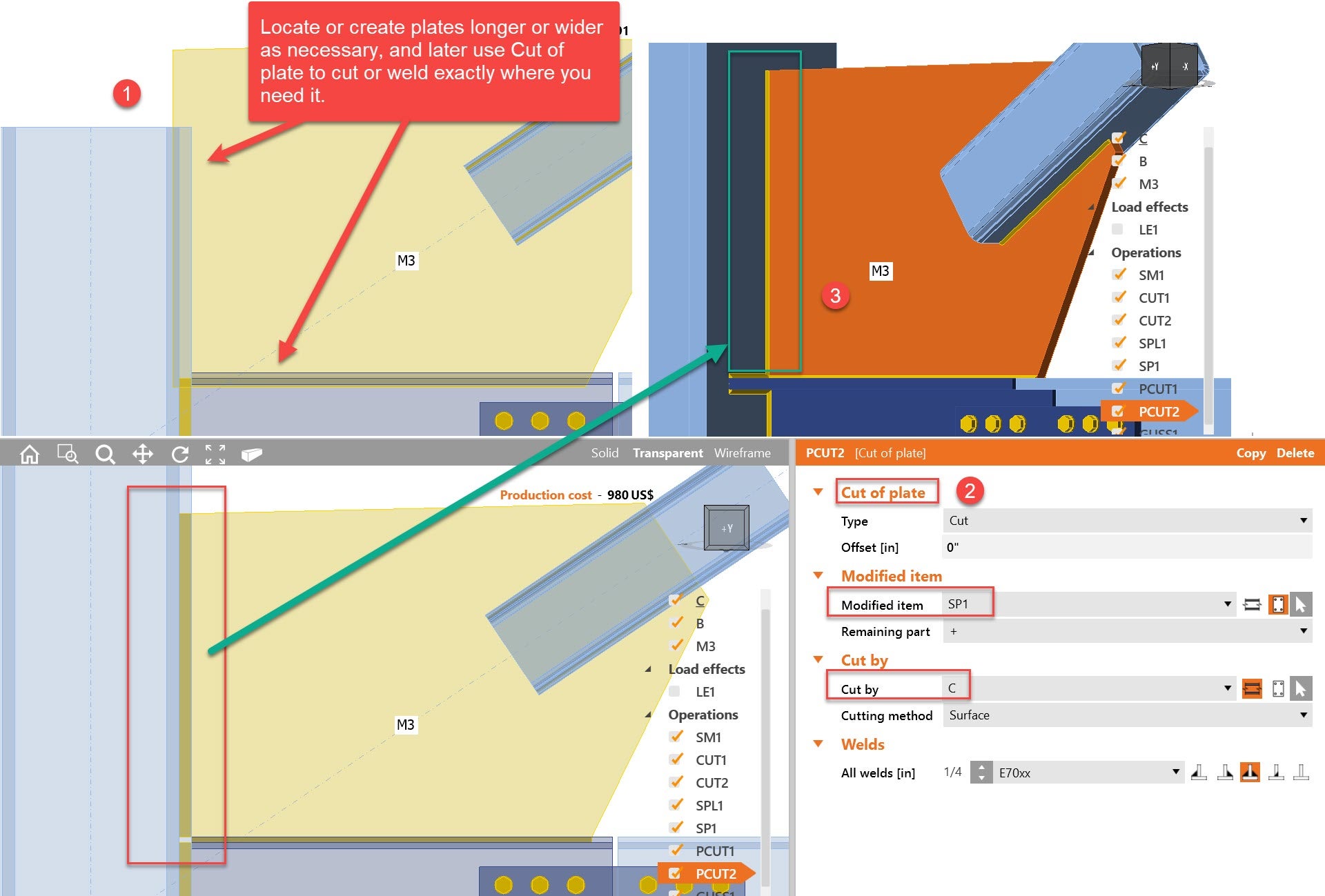 7. Start with larger than required plate size and use plate cut operation to align with members, etc..