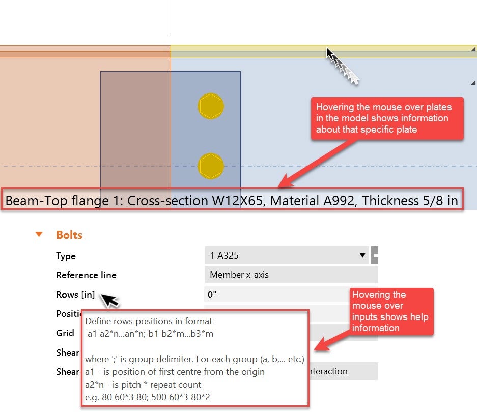 Immediate help can be provided when you hover the mouse over inputs or plates of the model:
