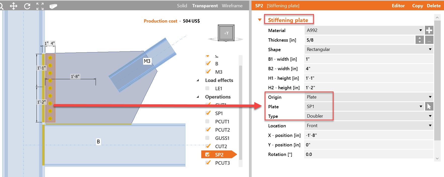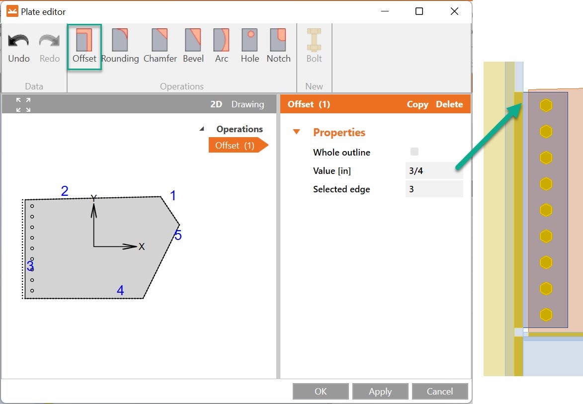 Stiffening plate operation has an editor, where the plate can be edited with sub-operations, in this case, the offset was used to create a ¾ gap between the Gusset and the column: