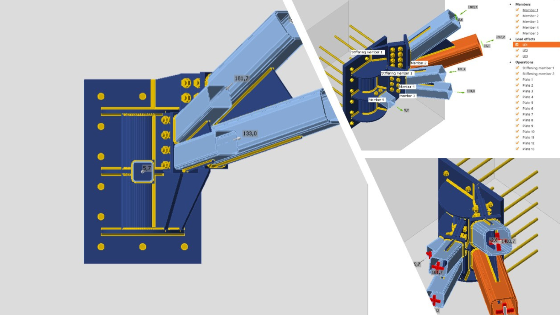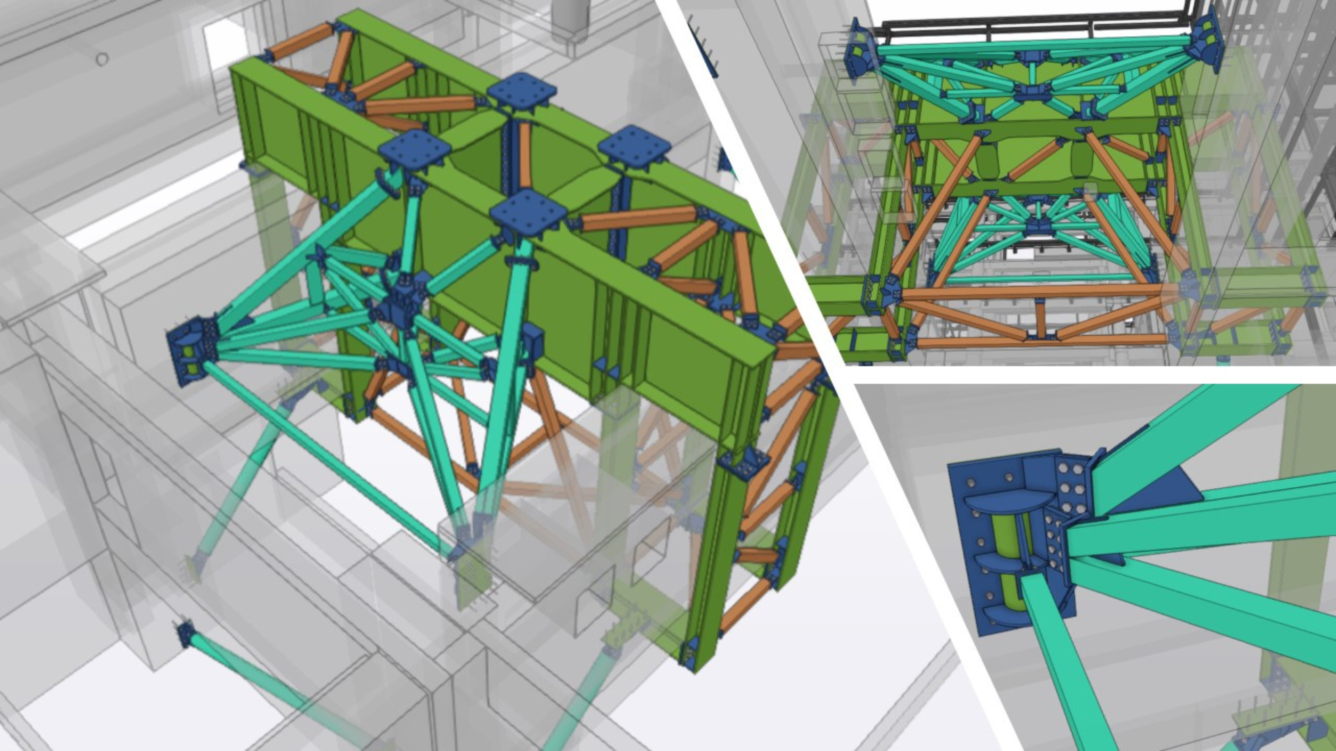This structure at the base of the cranes was then connected to deep permanent RC beams by means of an intricate steel-to-concrete joint connection, with several steel bars concurring to the same setting-out point. IDEA StatiCa Connection, along with Tekla Structures (from which the peculiar connection’s geometry was imported), were used, allowing the project to arrive at a reliable and precise solution.