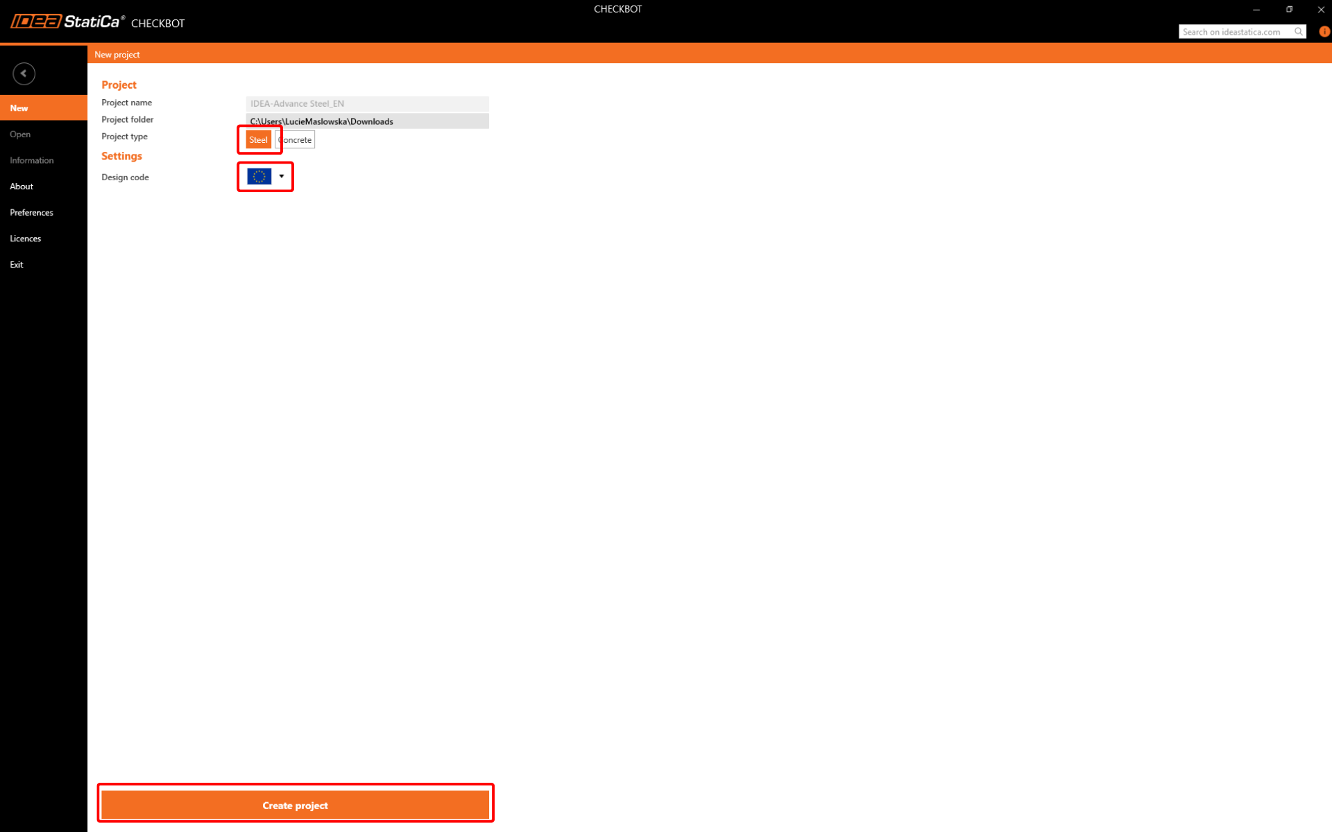 Select the New option with project type Steel and design code EN. Then select Create project.