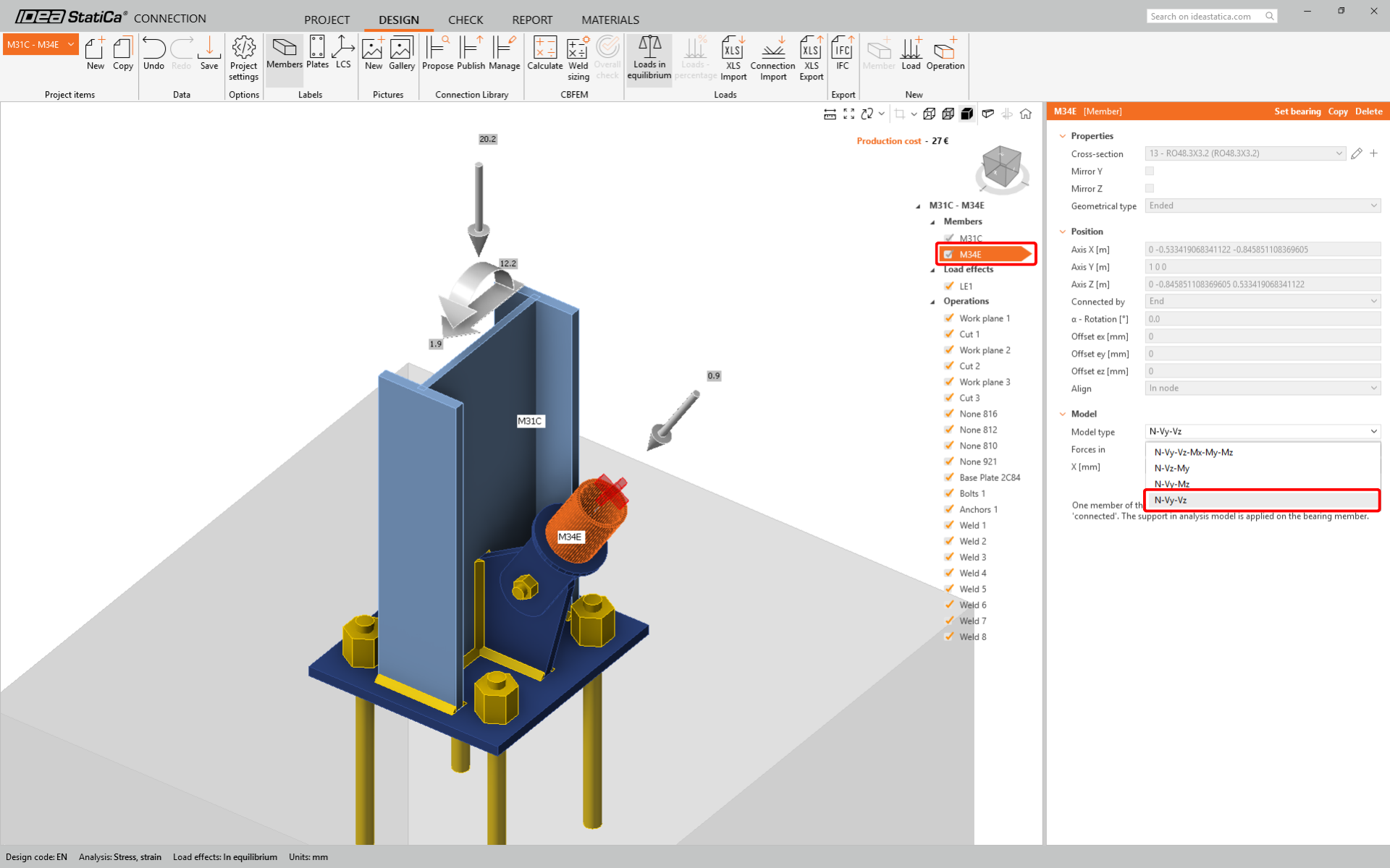 We are going to be using a single bolt connection for the diagonal brace. For this type of connection, we must also change the Model type of the brace member to N-Vy-Vz. Select the brace in the list of Members and modify the Model type in the drop-down list.