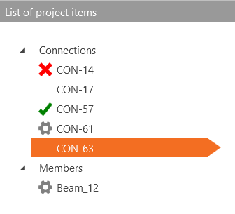 A lista de itens de projeto contém todas as ligações e elementos a desenhar. Cada item de projeto pode estar em vários estados diferentes. Logo após a importação, existe um ícone de roda dentada junto ao mesmo, significando a necessidade de definir mais o item antes de poder ser calculado. Assim que o item tiver sido suficientemente definido (existe pelo menos um caso de carga e uma operação de fabrico), o ícone da roda dentada desaparece e o item do projeto pode ser calculado (não é apresentado qualquer ícone). Após o cálculo, o item está no estado calculado e os resultados estão disponíveis (desde que o cálculo tenha decorrido sem excepções). É apresentado o ícone de um visto verde (aprovado) ou uma cruz vermelha (falhado).