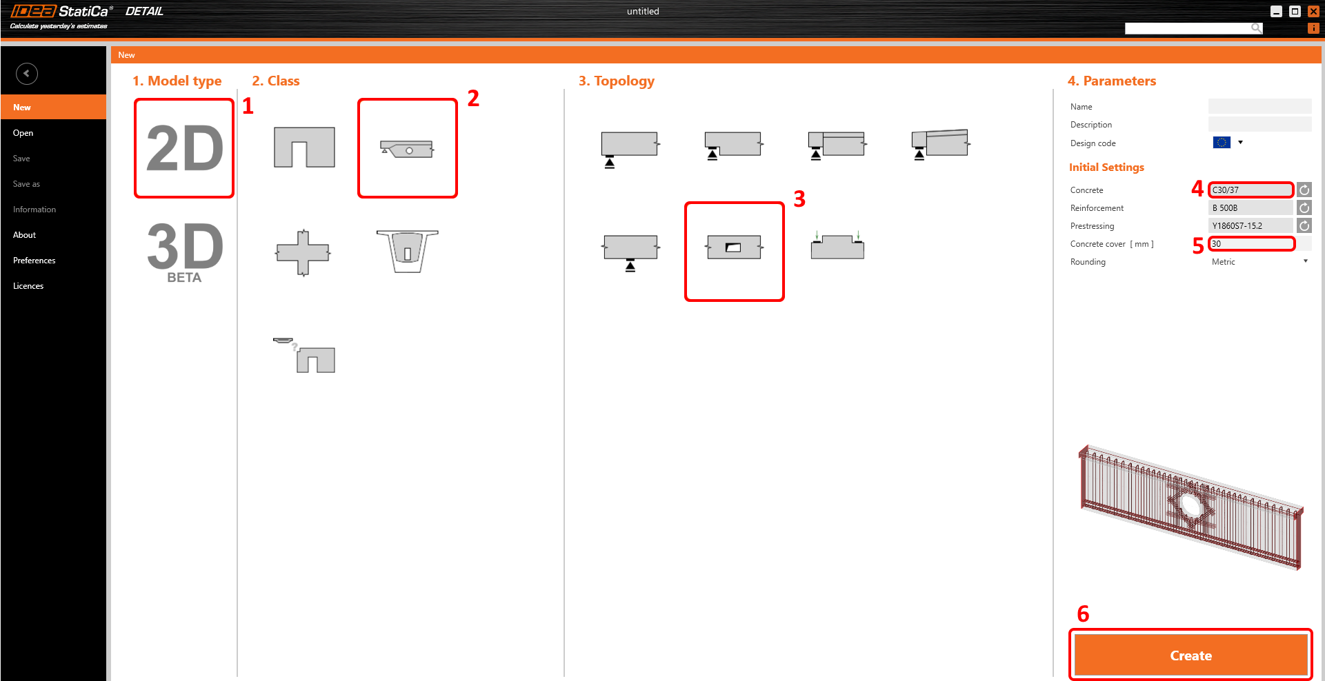 In the first step, select the desired class and topology, you can then define the design code (choose EN) as well as the concrete grade and cover (use concrete C30/37 and cover 30 mm). You can change your choice of material (or add another one) later, nevertheless, the design code can be chosen only in this first step of the project.
