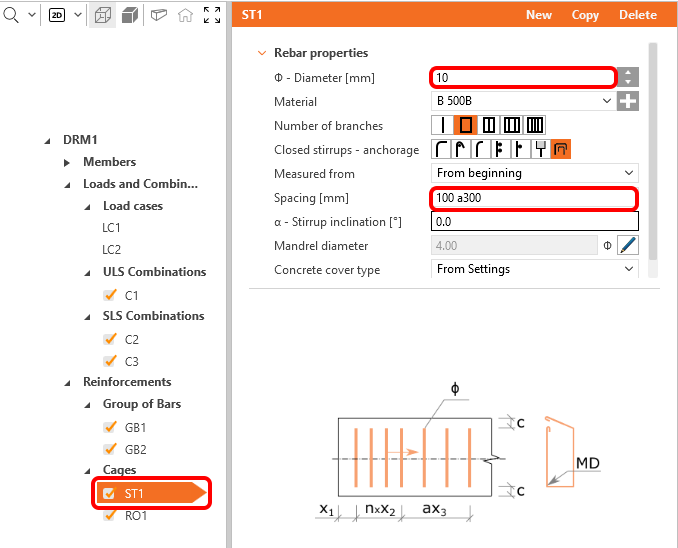 You can change the diameter of stirrups and adjust their distances (the first value corresponds to the distance of the first stirrup from the edge, the other stirrups will be distributed in distances given by the second value).