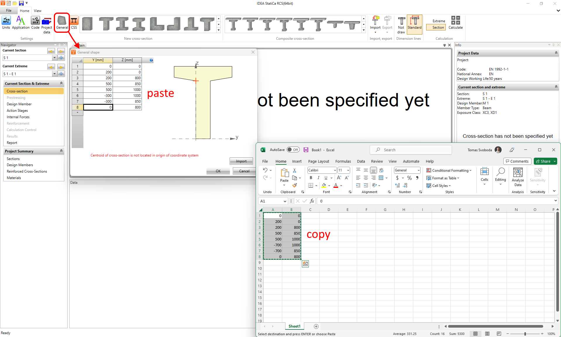 The first option is to create a cross-section by using coordinates. Click on the General button in the top ribbon and the input table will appear. After that, you can simply fill the table from your spreadsheet by using copy-paste method.