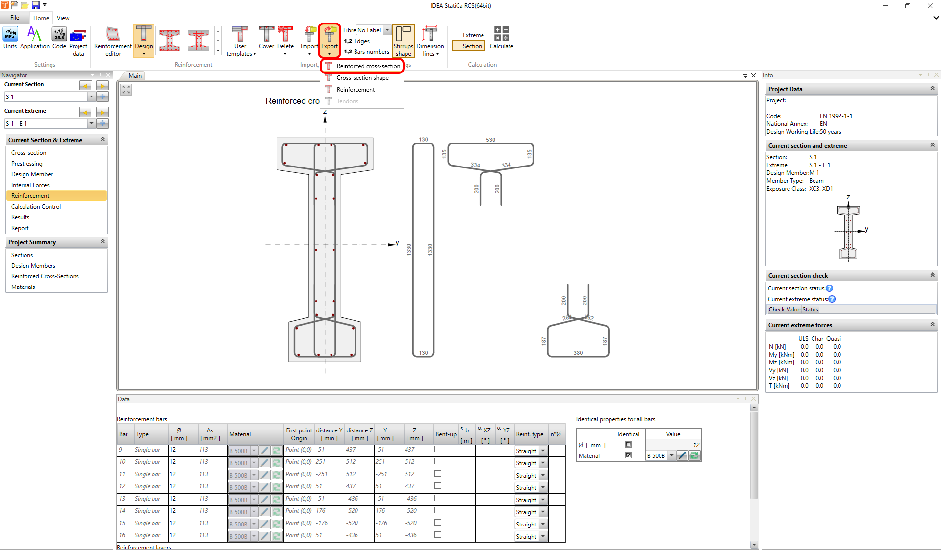 After that, you can import the whole cross-section to the new file or section. Or for example reinforcement to a new section.