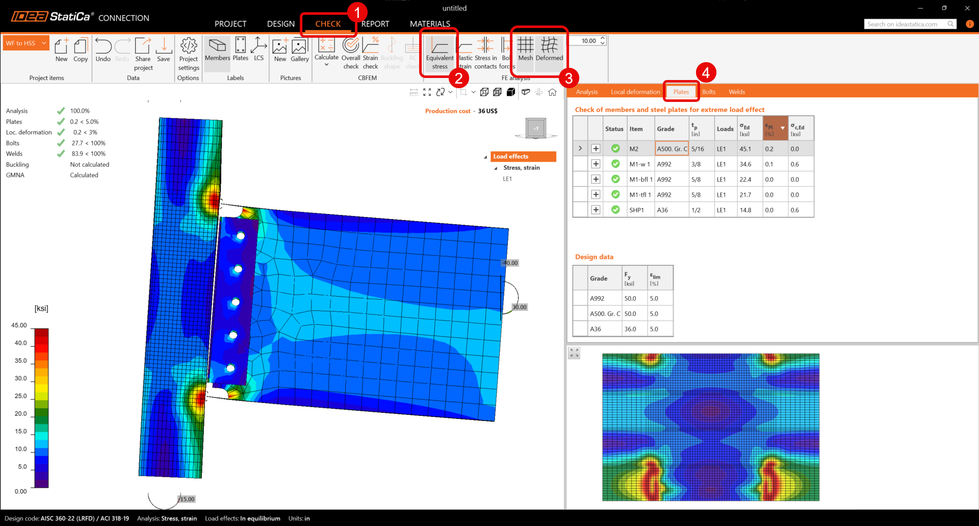When the analysis finishes, go to the Check tab and click on Equivalent stresses and deformed shape. The first check is the deformed shape to review if the deformation is logical. Also, you can see the summary of checks and confirm that the connection complies with AISC checks.