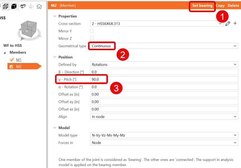 Click on the HSS member and, modify its properties to make it vertical, continuous and the bearing member.