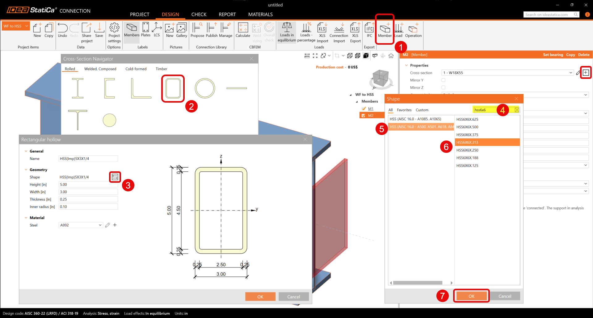 Add another member to model the column by clicking on the New member icon and then click the plus icon. Now select HSS profile, click the tree dots icon to select a HSS 6X6X0.313 within the HSS AISC 15.0 A500 database. Change the material of the HSS to A500 Grade C.
