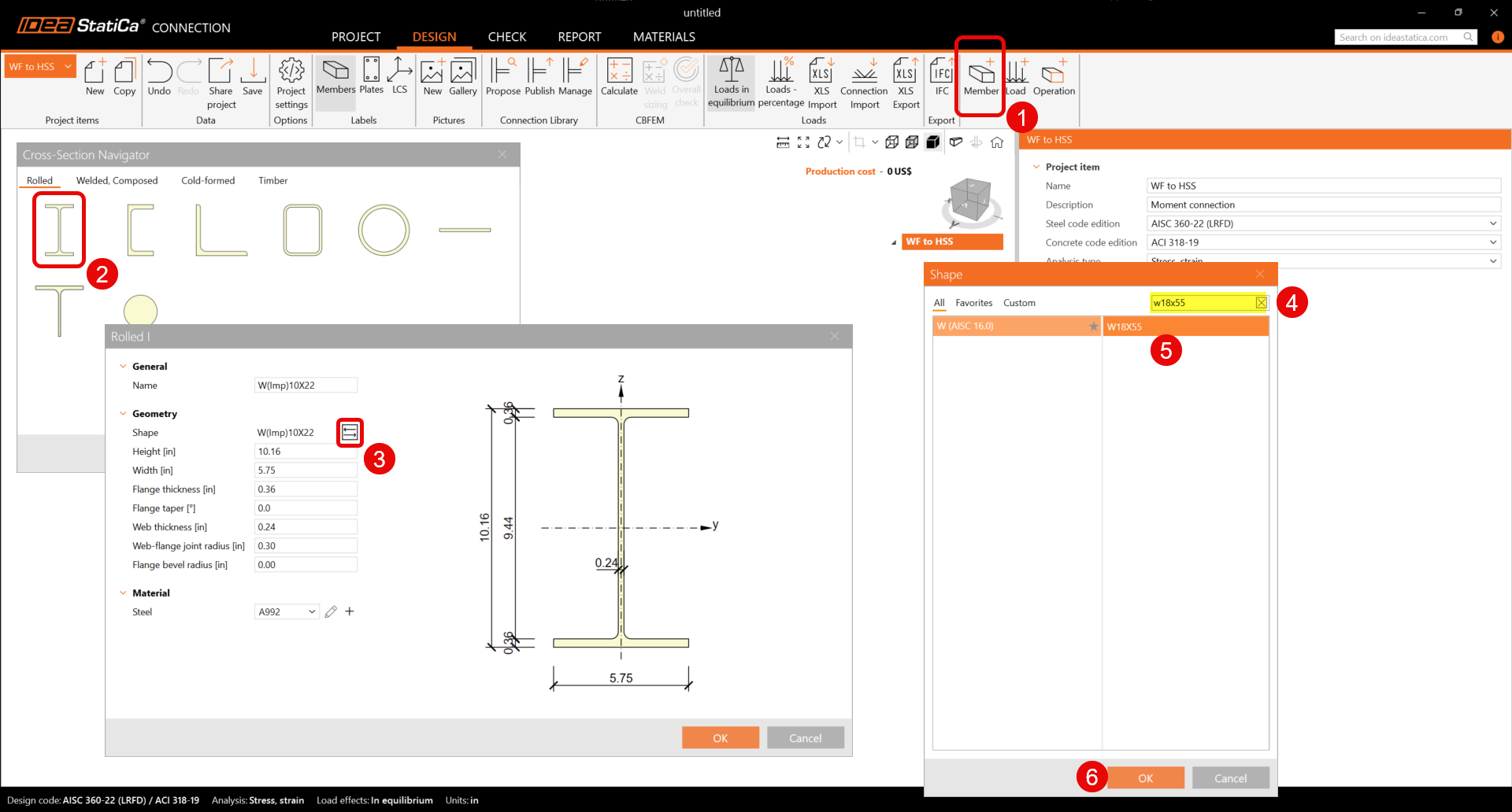 Add a new member by clicking on the New member icon. Select a Wide flange profile, then click the three dots icon to select the size. Search under W (AISC 15.0) for a W18x55 and click OK.