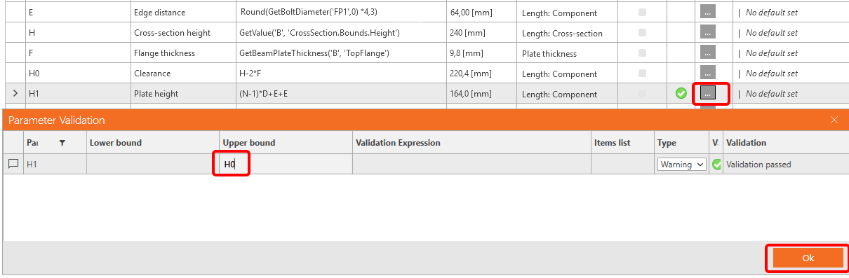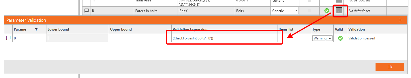For the field Number of bolts, we would like set a warning to have an imput of at least two bolts. For this, set the Lower bound to the value 2.