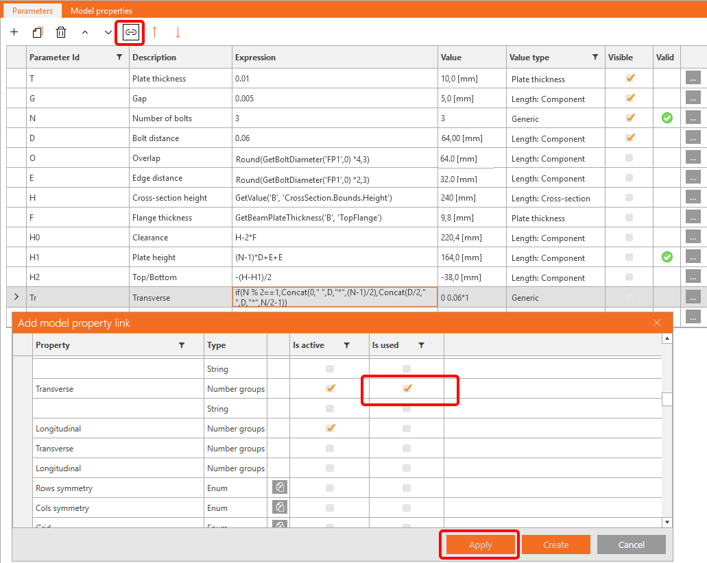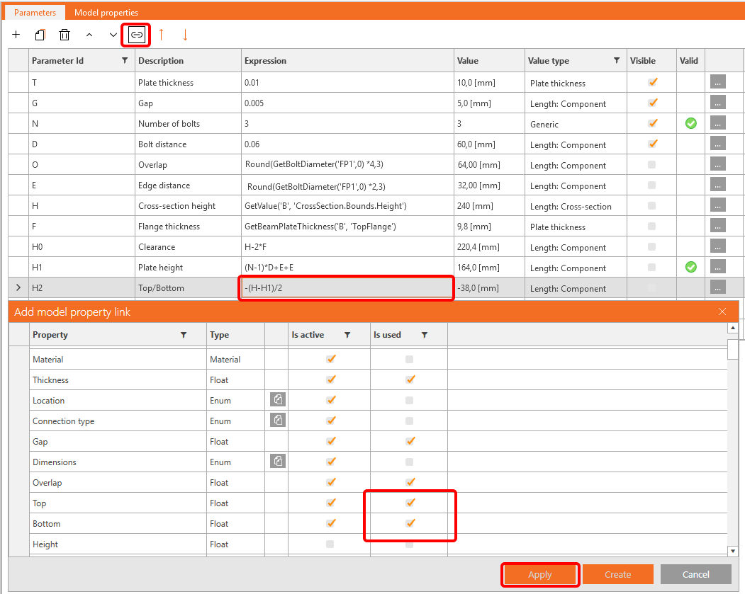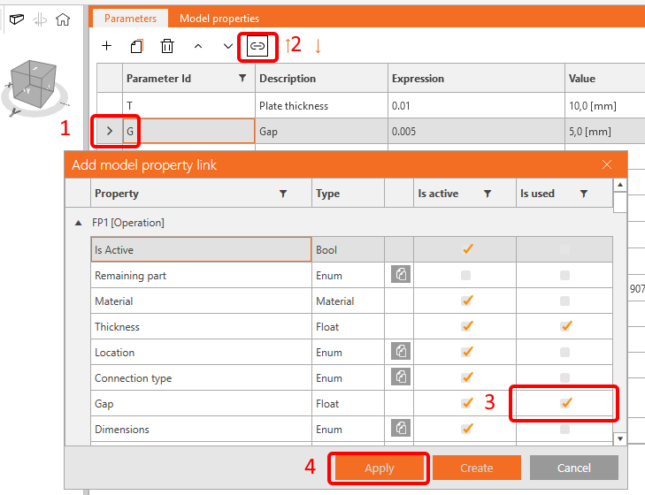 The parameters T (Plate thickness) an G (Gap) you can now directly link to the operation FP1.