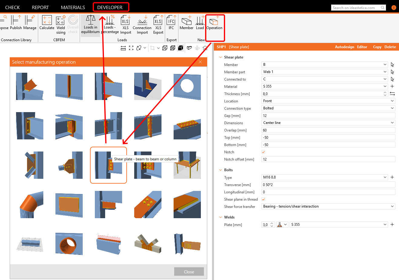 Apply the Operation Shear plate and switch to the Tab Developer.
