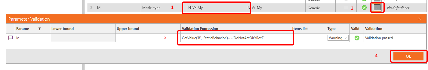 For the Model type we create parameter M with the value 'N-Vz-My' and set a validation warning to GetValue('B', 'StaticBehavior') == 'DoNotActDirYRotZ'.