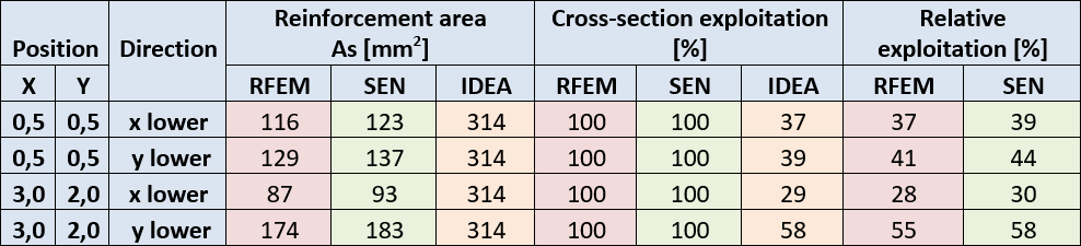 Uma vez que os programas RFEM e SEN não verificam a armadura real na laje, mas apenas dimensionam a área de armadura necessária, foram utilizados dois métodos para comparar o cálculo. O primeiro compara a exploração da secção para a armadura necessária dimensionada no RFEM e no SEN, assumindo que a secção é explorada a 100% apenas quando se utiliza a área de armadura necessária calculada.
