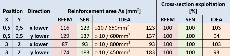A armadura com aproximadamente a mesma área foi definida no IDEA Concrete como a armadura necessária calculada no RFEM e no SEN para o segundo método. Posteriormente, a exploração da secção foi comparada. Os resultados são apresentados na tabela seguinte: