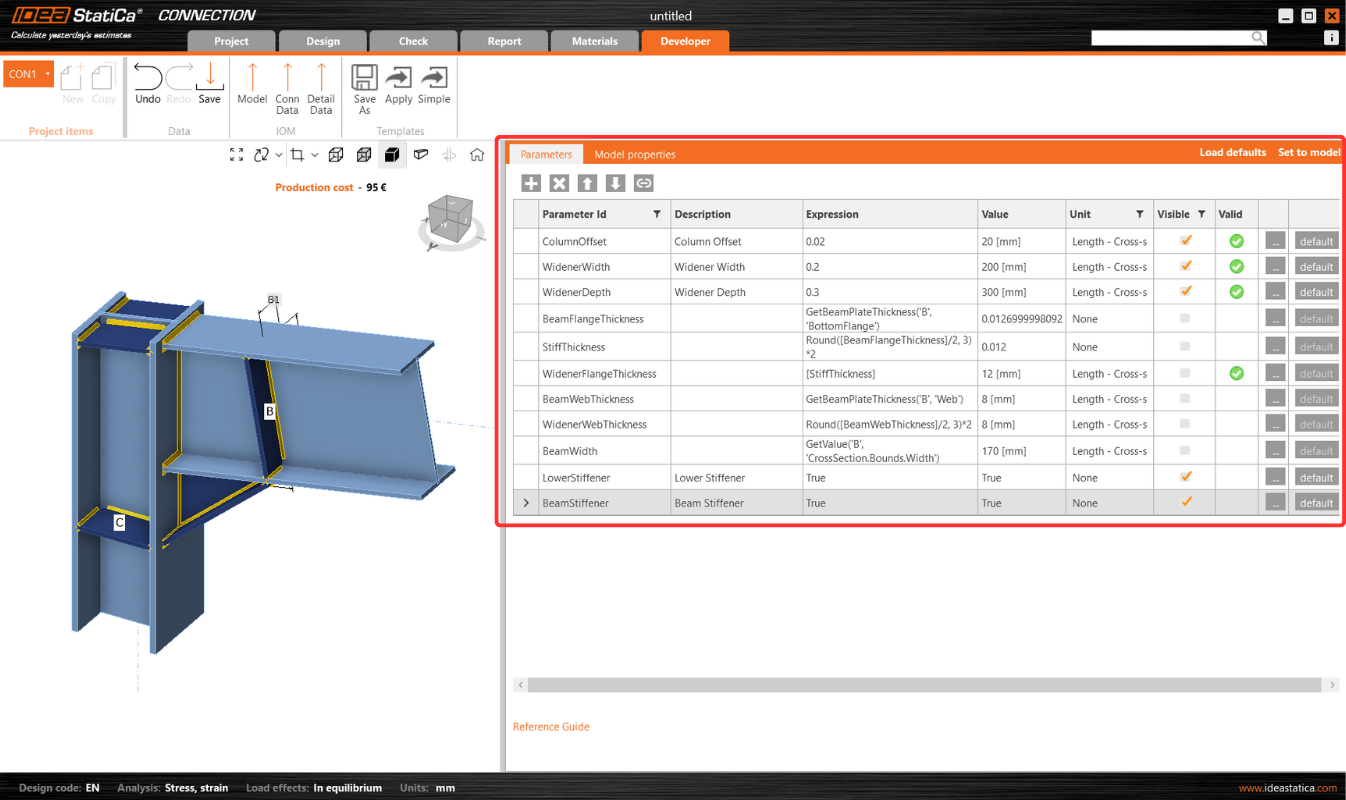 Practically anyone can activate the developer mode/tab in IDEA StatiCa Connection. Here, you can set parameters that can be linked to specific components based on your specified logic. So, when you modify one component, the other linked elements automatically adjust accordingly.