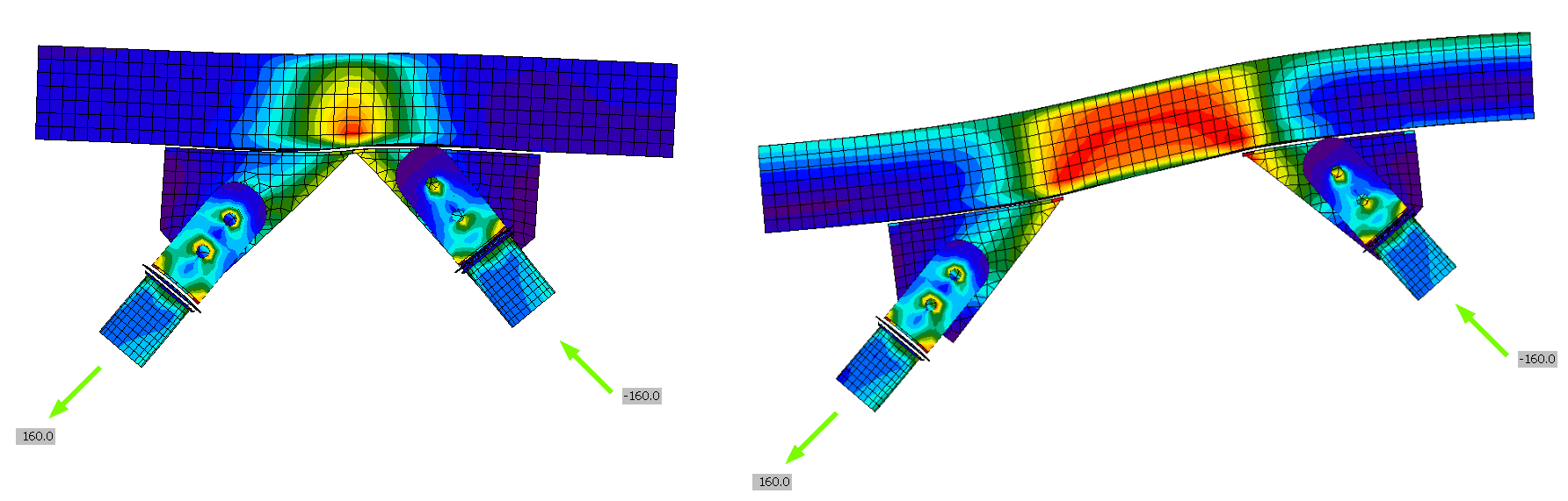 And what’s an even more common difference, the axes of bracing members have eccentricities to the optimal in-nodal direction. The reasons for this vary – it’s due to the fabrication, constructability, or aesthetical purposes. Quite often, the ideal direction of bracing members would cause unreasonable big gusset plates or collisions with other members. Sometimes other technology or equipment could be the reason for shifting the bracing members from the node.