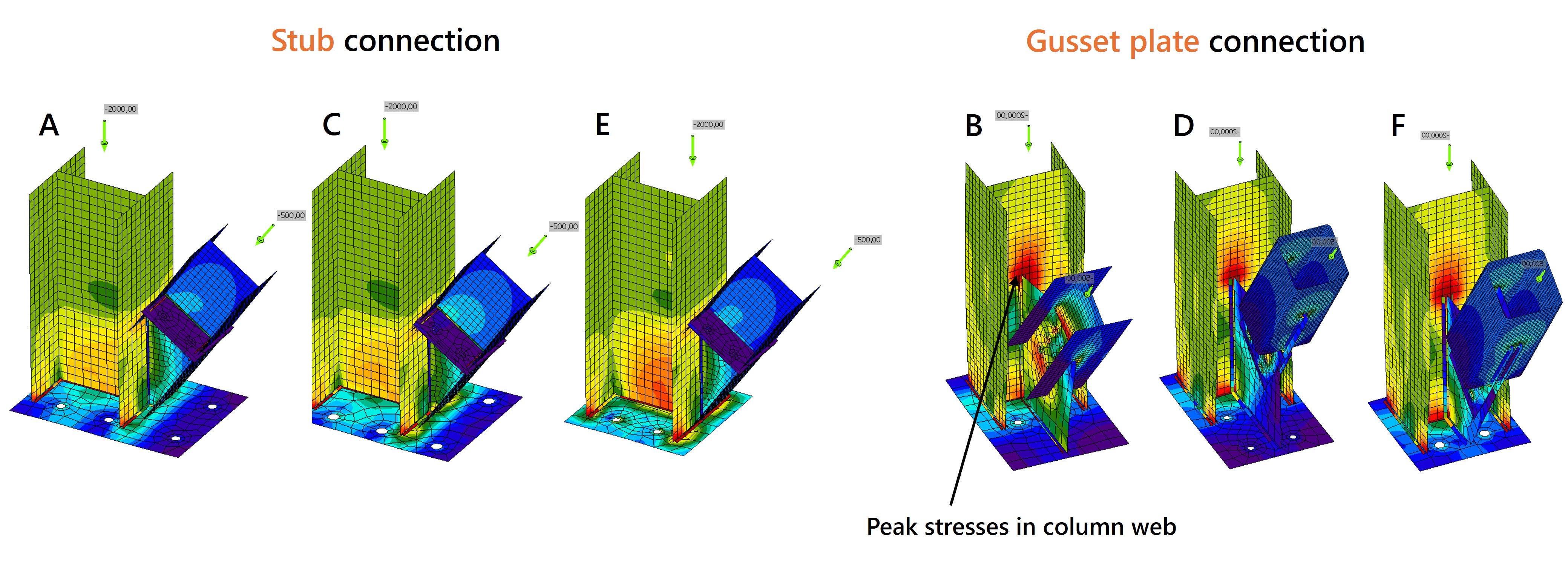 The Stub connection design provides direct transfer of compressive force without complications in the connection. By opting for an HEA profile, bolt assembly is easily feasible and the web of the diagonal member is aligned with the web of the column. As a result, the stresses are well transmitted into the column, as seen in the solutions of groups A, C and E (see figure).