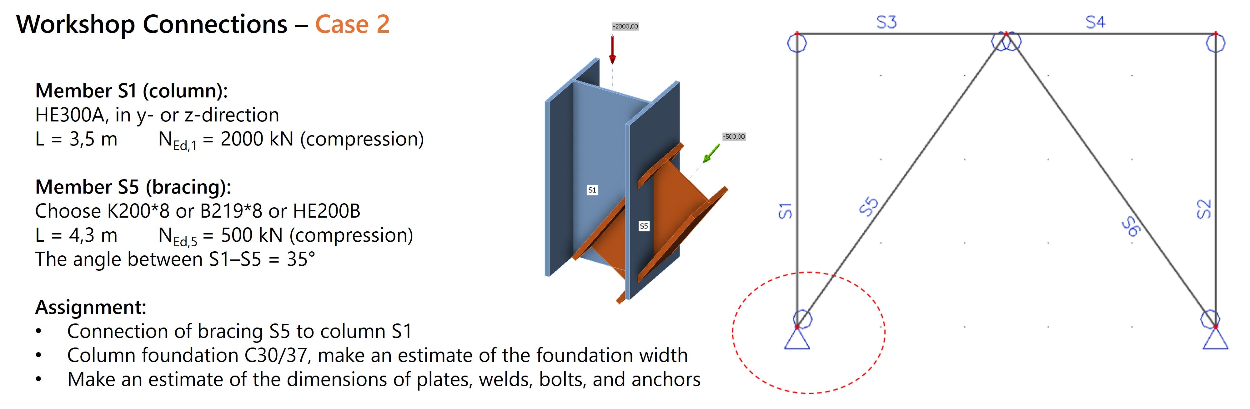 The second design challenge involves a column baseplate connection. The diagonal bracing can be made in three different profiles and is loaded with a compressive force of 500 kN. The column itself experiences a significant compressive force of 2000 kN.