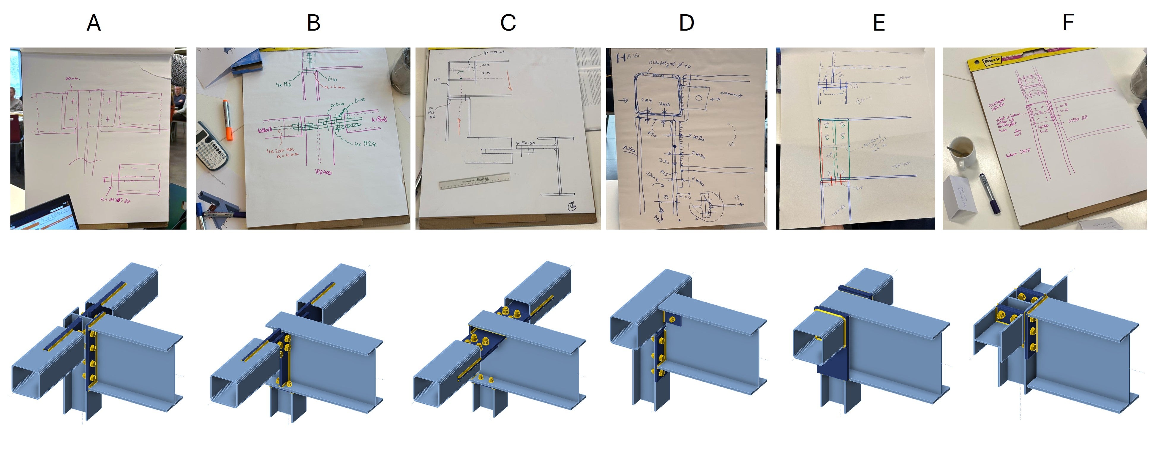 Below is an overview of the connections, sketches and models worked out in the steel connection software IDEA StatiCa. We then discuss each connection and highlight key insights from the discussions and results.