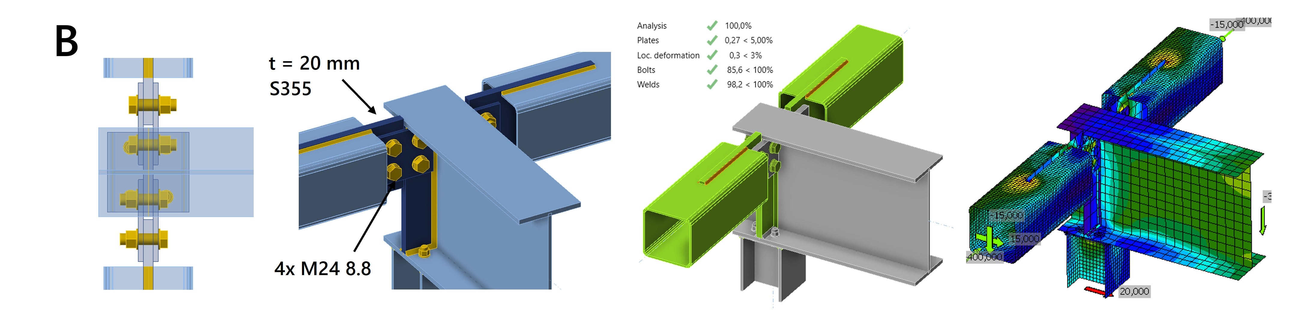 Group B had a similar connection, but here the main beam was extended. Choosing a symmetrical connection of the square hollow section (SHS) beams avoids the additional bending moment. With the prescribed plate thicknesses, the plastic strain is just under 5% limit.