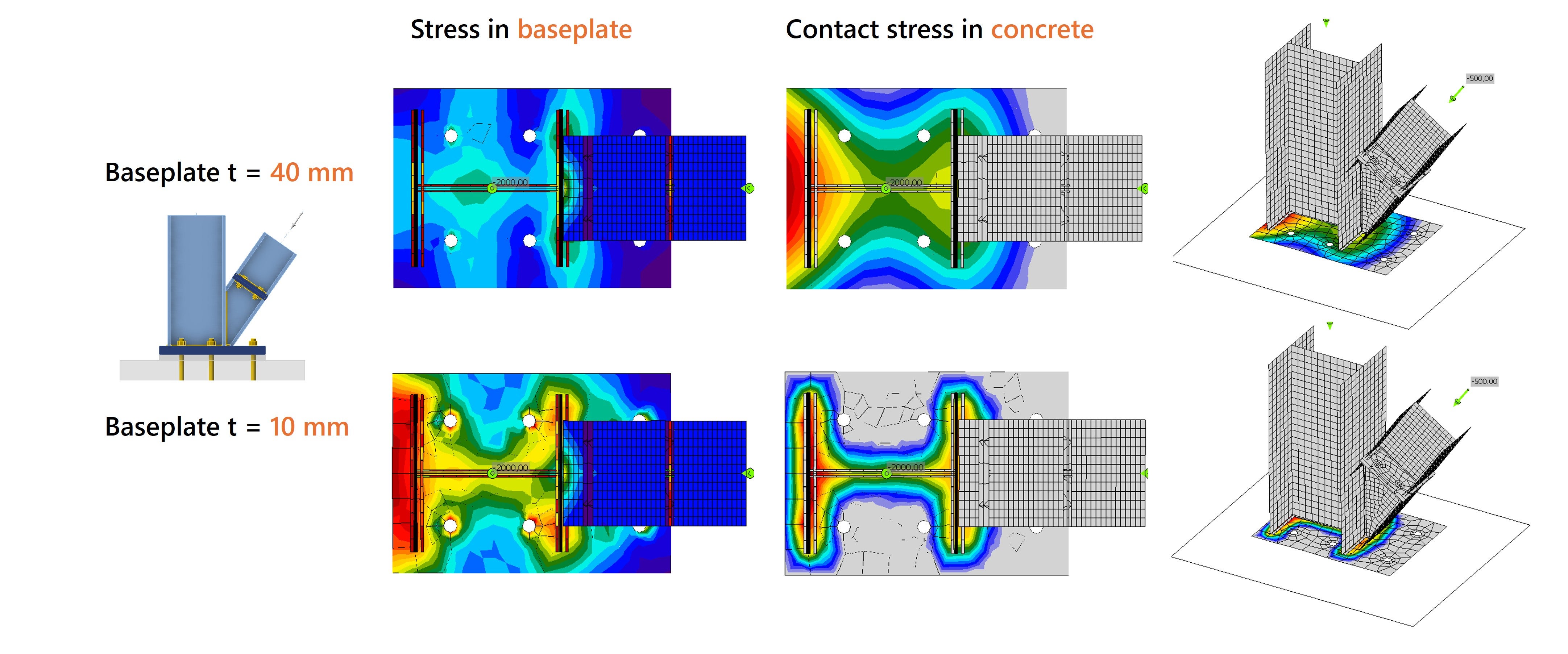 The figure below compares the stresses in the baseplate and the contact stresses in the concrete for a baseplate 40 mm and 10 mm thick. If the base plate is too thin, stresses concentrate around the column profile instead of being effectively distributed. As a result, the effective contact area on the concrete becomes too small, leading to compressive stresses that exceed the permissible limit.