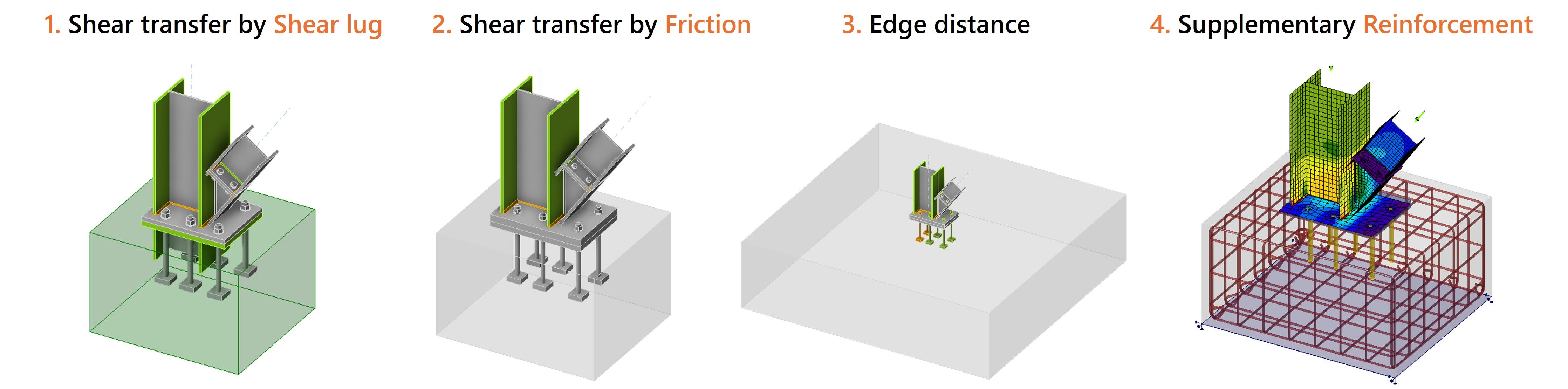1. Optimize shear force transfer by adding a shear lug. This way, all shear is transferred by the shear key and the failure of the anchors and concrete breakout is avoided.