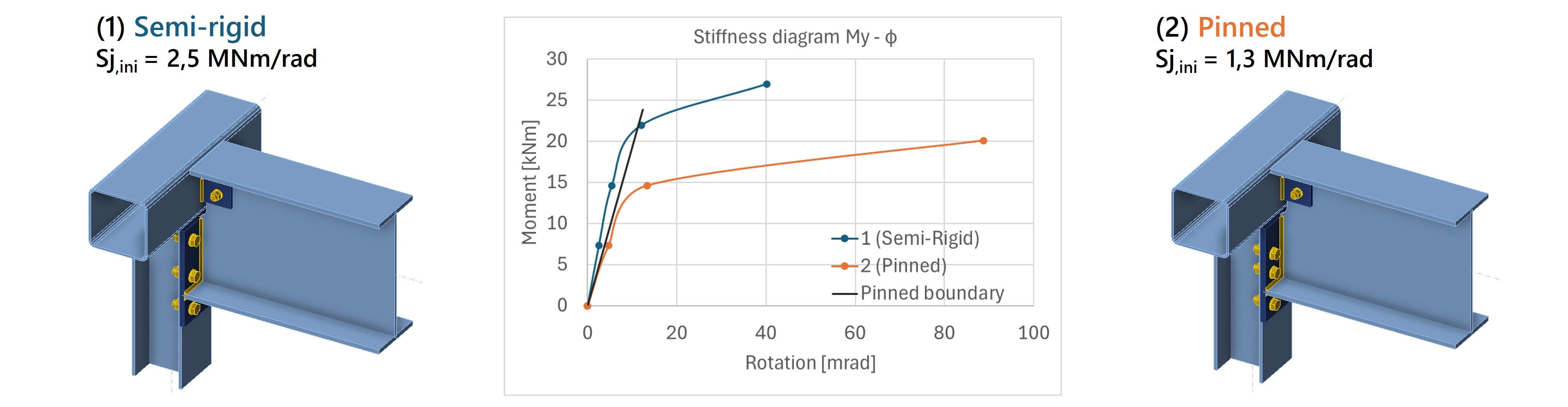 To determine the exact stiffness of the joint, stiffness analysis can be performed with IDEA StatiCa. The moment-rotation diagram is generated and based on the Eurocode, the joint can be classified as fully rigid, semi-rigid, or pinned.