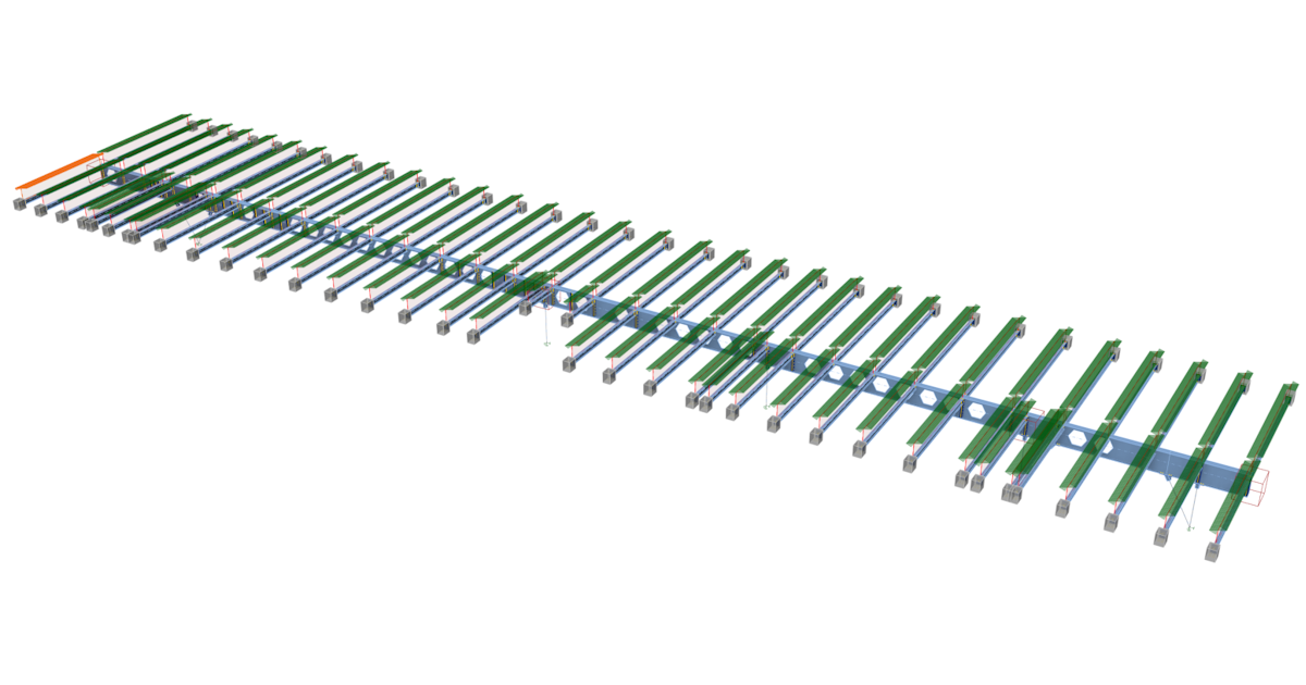 Choosing the castellated beam was clearly the best option but also introduced additional challenges, particularly in ensuring the structure's stability against lateral-torsional buckling and other forms of buckling. As a continuous beam, stabilizing the lower flange in the supported areas was essential. Typically, diagonal restraints would be used to address this issue, but this solution was not feasible due to the placement of ventilation pipes and architectural requirements for the space adjacent to the beam. As a result, "secondary beams", perpendicular to the castellated beam, were utilized to provide the necessary stabilization.