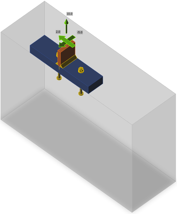 The anchor layout and base plate–column T-section is unrealistic but it serves as a verification of most features in anchor design. The offset of concrete block to the base plate is 200 mm upwards and to the left, 300 mm to the right and 0 mm downwards. The height of concrete block is 600 mm. Left and right anchors are 50 mm and 100 mm from the center of the column, respectively. This serves to achieve tensile and shear load eccentricity. All plates are designed to stay in elastic state.